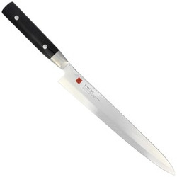 Due Cigni Sashimi 215mm in 420JS stainless steel. Made by artisans in Japan, with a comfortable round maple wood handle. The long, narrow blade is perfect for cutting meats or fish for sushi. Note!!! Very sharp!!!