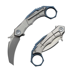 Tayra Blue Titanium, Hand Rubbed Satin, karambit folding knife with titanium handle, M390 steel blade and reliable frame lock. A sophisticated design for users looking for functionality, durability and aggressive aesthetics.