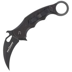 The FX-599 folder by FOX shows how much traditional Asian karambit knives have evolved. Covered coated Idroglider Black, blade made of Hawkbill N690Co steel, Clip Tip-Up type, three quick release systems, Emerson hook, flipper and oval cutout.