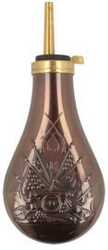 DP523-44, Davide Pedersoli powder flask with a dispenser. Designed for .44 caliber Colt black powder revolvers. Powder charge: 24 grains. Made of lacquered copper with a battle scene motif and a brass dispenser.