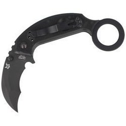The FX-599 folder by FOX shows how much traditional Asian karambit knives have evolved. Covered coated Idroglider Black, blade made of Hawkbill N690Co steel, Clip Tip-Up type, three quick release systems, Emerson hook, flipper and oval cutout.