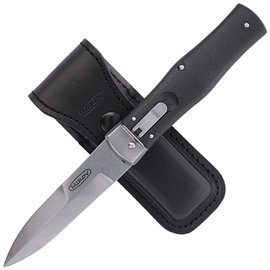 Predator Black ABS, Stonewashed Mikov automatic knife with stonewash blade made of N690 steel. Solid construction, two strong opening springs, characteristic click when opening distinguish Predator from other spring knives. Leather case