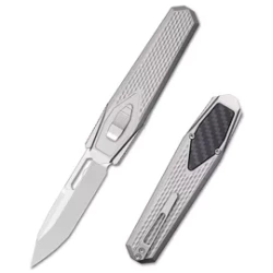 Swordfish Titanium/Carbon Fiber, Pearlescent. An innovative knife from the young Remette Knives manufactory. OTF with an extendable blade made of Böhler M390 steel thanks to the force of gravity. Handle made of titanium with an smarta blade release system