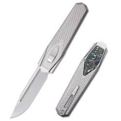 Swordfish Titanium / Carbon Fiber, Pearlescent. An innovative knife from the young Remette Knives manufactory. OTF with an extendable blade made of Böhler M390 steel by gravity. Handle made of titanium with an smart blade release system.