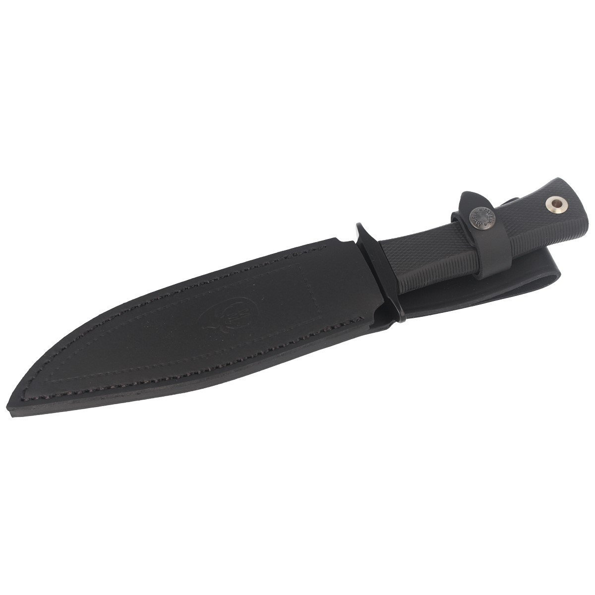 Case - in black color. Made of natural leather, fastened with a snap fastening allows safe carrying of the knife. The edges of the sheath were sewn with a decorative thread. The embossed manufacturer's logo on the front. The sheath has a belt attachment or packs to carry the knife in a vertical position.