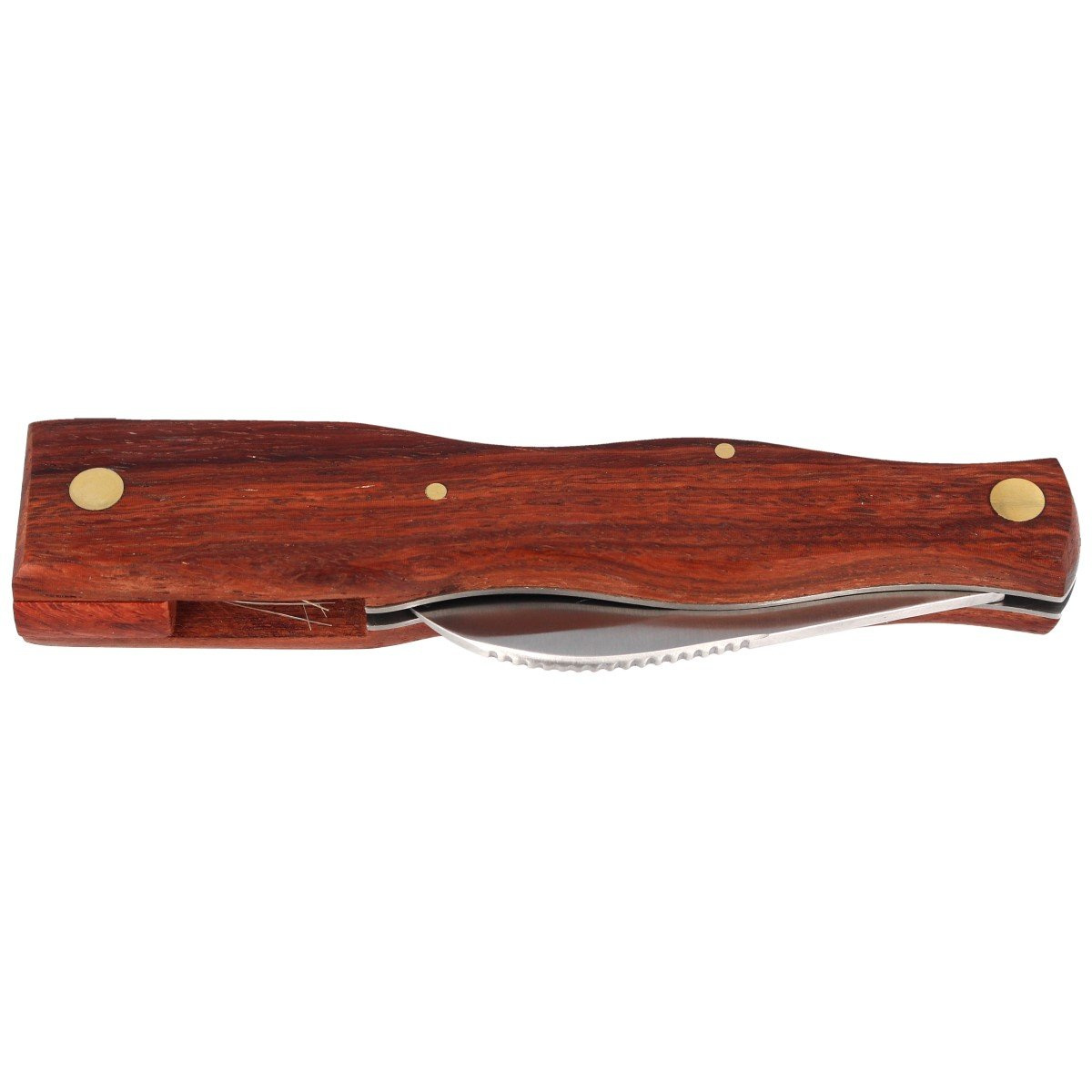 Handle - covered with profiled claddings made od colored wood. In the back of the handle there is a retractable brush for cleaning mushrooms. The compact size (after folding the brush) allows you to easily carry the knife in your pocket. The rivets are made of brass.