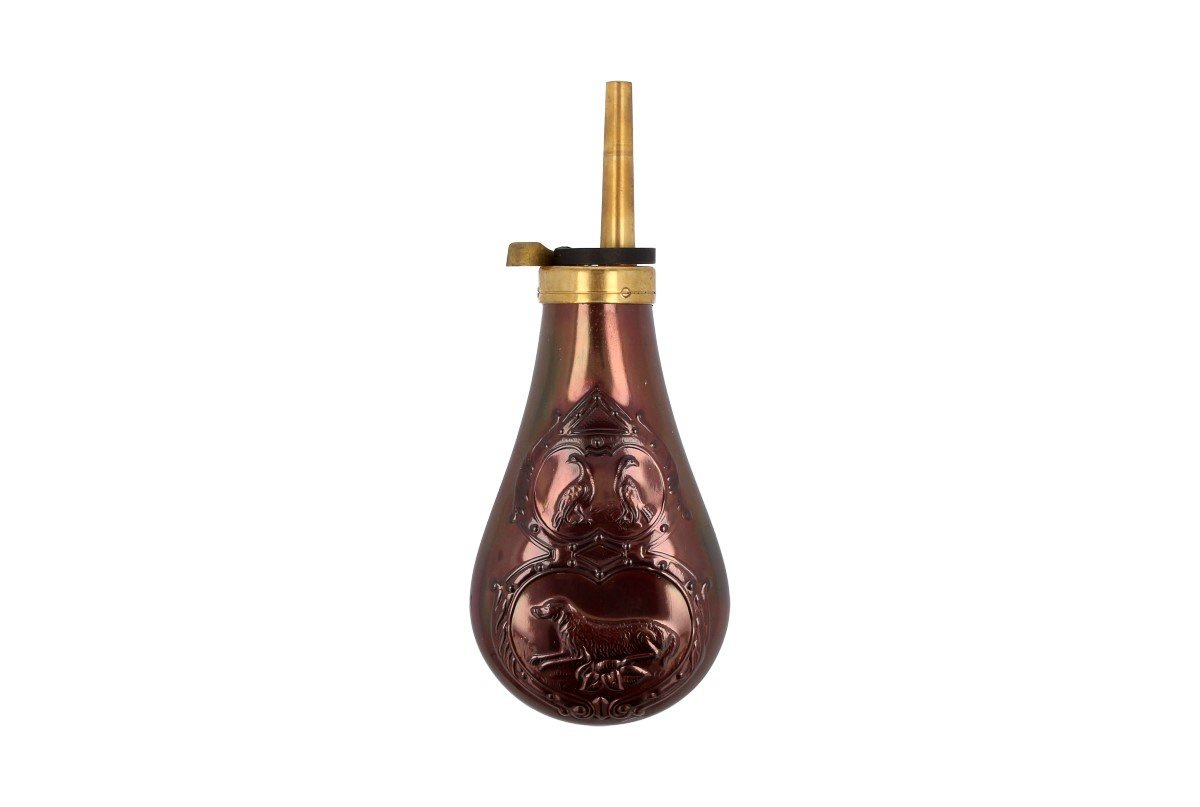 Remington Pattern Powder Flask .44 (030D529440) - powder flask with dispenser made by Italian company Davide Pedersoli. Designed for Remington black powder revolvers made by Pietta and Uberti in .44 caliber. Powder charge: 24 grains. The powder flask features a hunting motif, depicting a dog and 2 pheasants. Crafted from lacquered copper, with a brass dispenser.