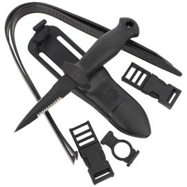 Sheath - made of PE (polyethylene) plastic with holes for drainage of water, moisture. The holster is equipped with a latch to prevent the knife from slipping out in water. The sheath comes with two rubber straps and 2 plastic buckles for attaching the case to the hand, leg or to a vest.