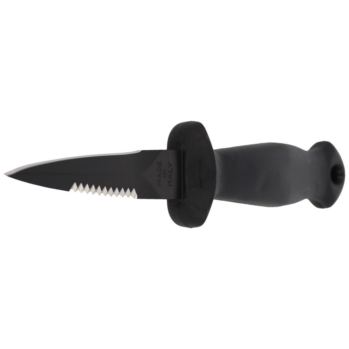 Blade - with Dagger (dagger) profile, both sides with excellent cutting properties were derived with Flat Grind. One of the blades fully smooth Plain, the other serrated Serrated ending on the side of the tip with a few millimeters of smooth blade. The Serrated blade is used in diving, rescue and survival knives, ideal for aggressive cutting of hard materials, plastics and fibrous materials such as ropes and nets. The blade is coated with a matte, scratch-resistant non-reflective IDROGLIDER GOLD® Black coating.