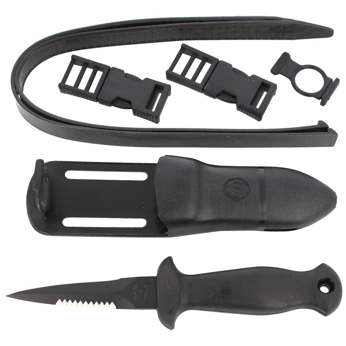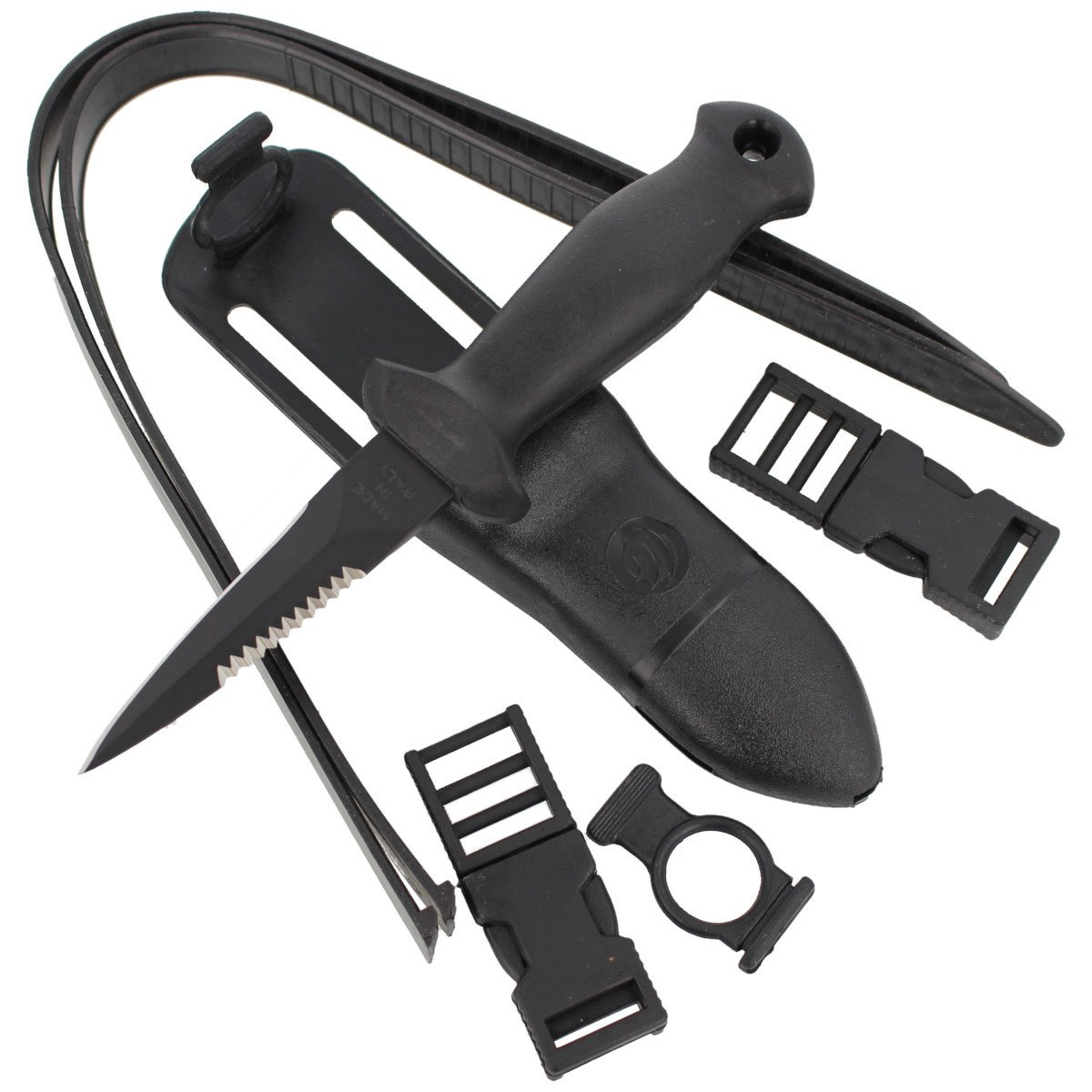SUB 9 STILETTO BLACK 2 compact diver's knife (back-up) of full tang construction with a fixed blade coated in matte black Manufactured by the Italian company MAC Coltellerie. Suitable for use during diving expeditions and on land.