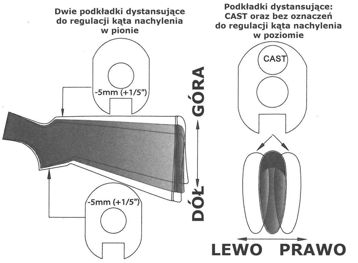 Spacers - allow adjustment of the angle of the flask in two planes. Thanks to the included four spacers the process of customizing the rifle is quick and uncomplicated. Simply insert the appropriately shaped spacers between the breech chamber and the butt to configure the rifle according to your preferences as well as your shooting style.