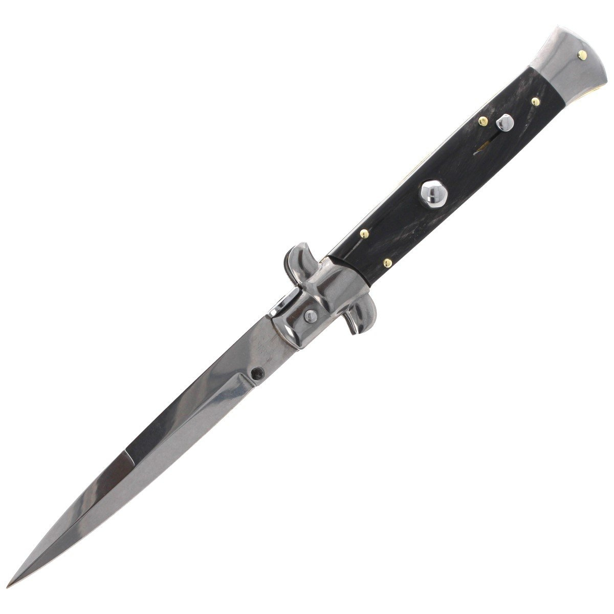 - Frank Beltrame Stiletto Bayonet Bull Horn 23cm. Traditional hand-folded Italian spring knife - buffalo horn facings. The iconic folder when opening the hundredths-of-a-second blade emits a distinctive click that sets it apart from other spring knives...