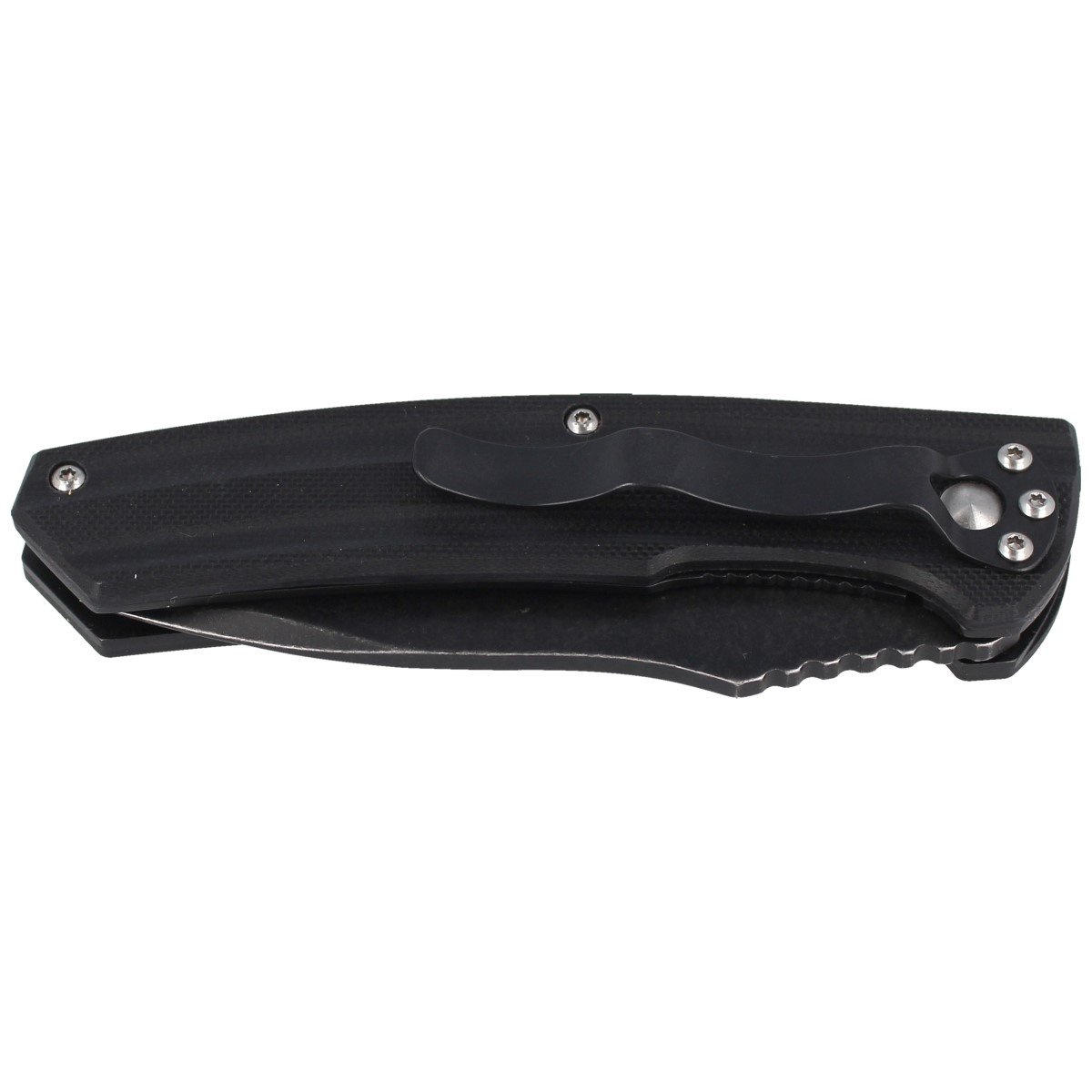 Handle - covered with textured black claddings. Made of durable G-10 material, resistant to high and low temperatures and chemicals. The solid metal clip, screwed with torx screws, allows the knife to be moved in the tip-down position. Spine Jimping corrugated incision on the back of the handle increase grip reliability, also with wet hands.
