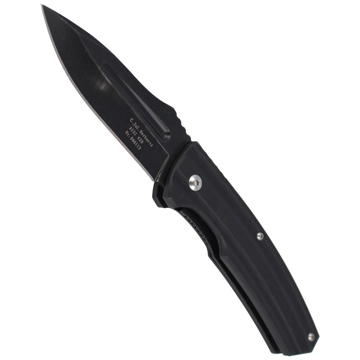 • 566112 A well-balanced, solid and durable folder from Herbertz Solingen. Works in all conditions, as EDC and during trips out of town. Blade with a Drop Point profile made of 420 steel. G-10 handle linings. Tip-down clip.