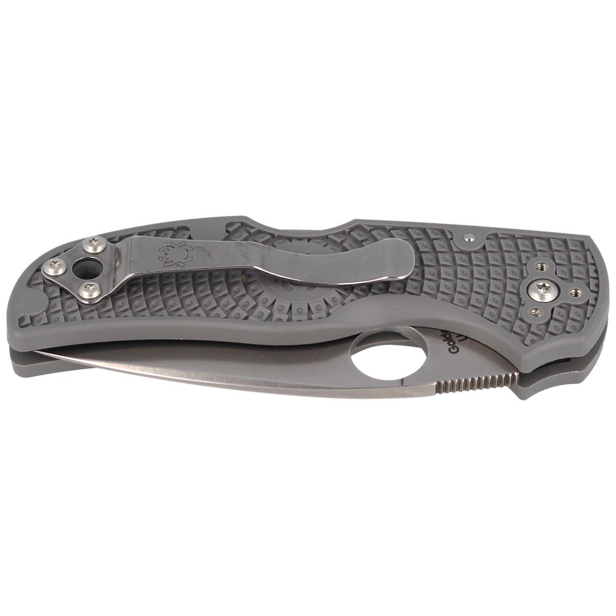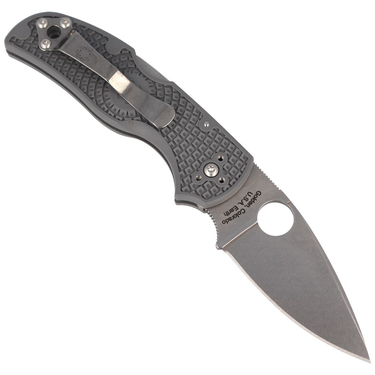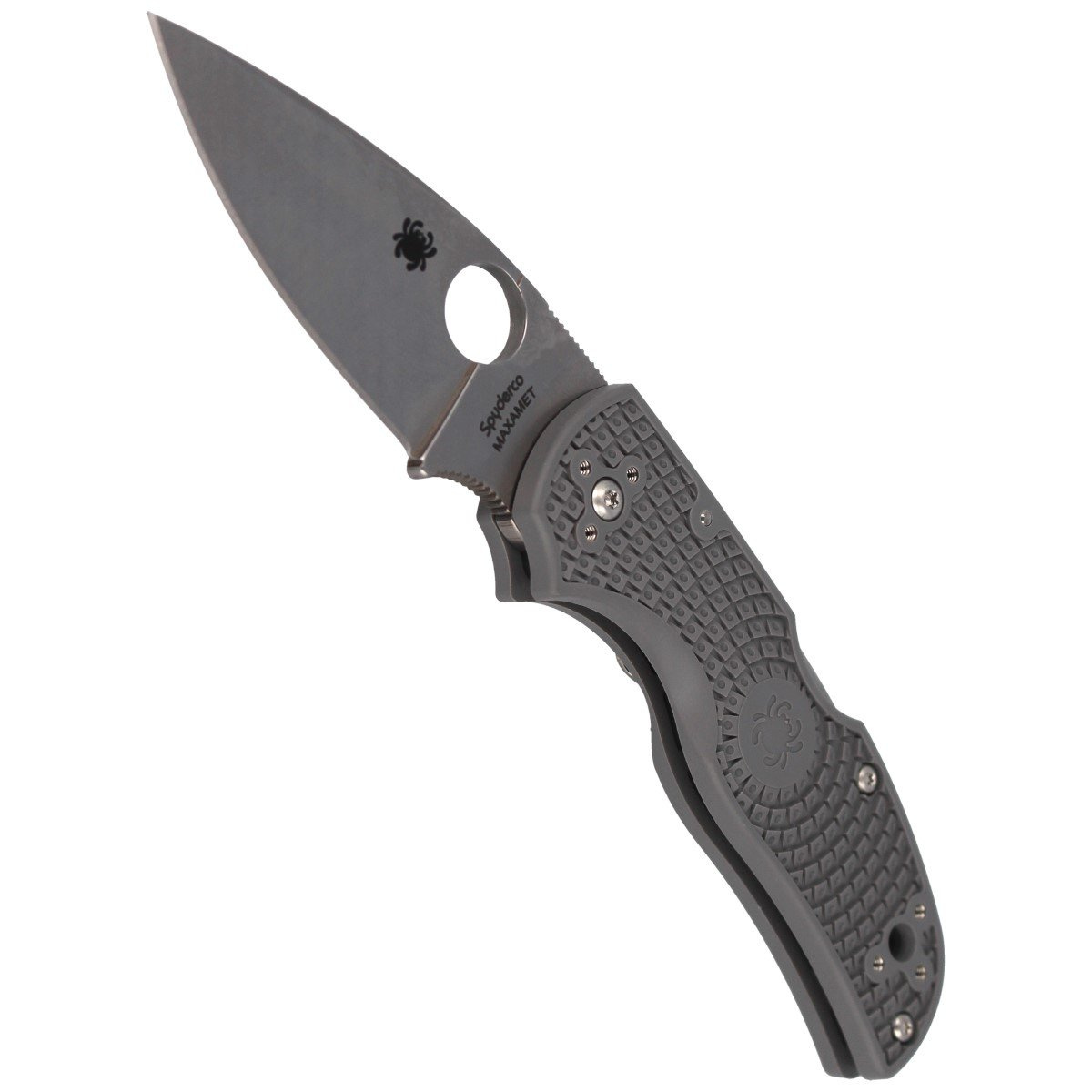 Blade - with a Spear Point profile, 3.2 mm thickness. Smooth blade (Plain type) was made with a full flat cut (Full Flat Grind), reducing the weight of the knife and increased cutting properties. The Satin Finish (semi-matte) coating eliminates glares. An enlarged 14 mm round SpyderHole cut-out (Spyderco patent) allows the knife to be opened with the thumb. High-quality (made in the USA) solid blockade (Back-Lock type) guarantees better smooth operation. Notched thumb ramp and Finger Choil (profiled undercut finger between the handle and the cutting edge) increase control over the knife.