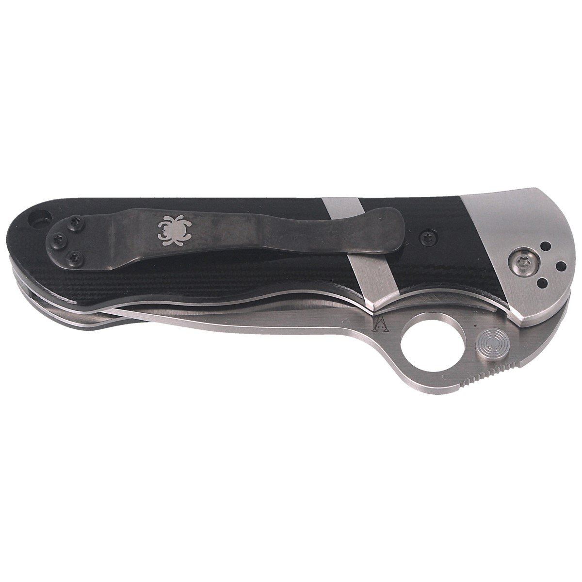 Blade - with the Drop Point profile, 3.5 mm thickness. Smooth blade (Plain type) was made with a concave cut (Hollow Grind) for effective deep cuts. The enlarged 14 mm round SpyderHole notch (Spyderco patent) has increased the thumb support (ramp), which places the thumb directly above the hole allowing quick opening of the knife also in the glove as well as wet, sweaty hands. Pleated thumb ramp on the spine of the blade for efficient operation of the folder. The blade blockade, strong Liner-Lock mechanism.