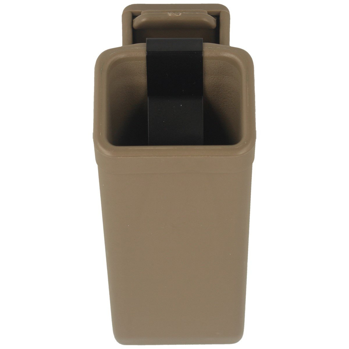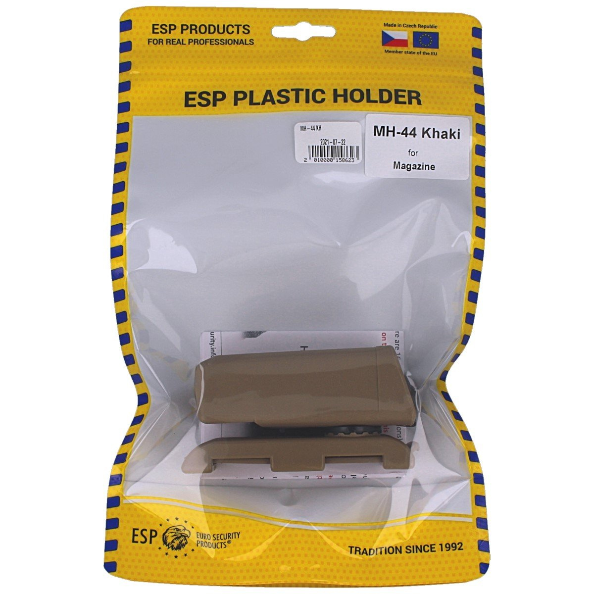 MH-44 KH, polymer open type loader in color khaki for a double-row magazine in cal. 9 x 19 mm Para with belt attachment type UBC-04-1 of the Czech company ESP. Internal spring holds magazine, allows for quick withdrawal. Fits m.in. Glock, Walther P99, H&K, Beretta 92/96/M9, Springfield XD, Ruger, Browning HP, SIG Sauer P226/P229, S&W MP9, CZ 75 Compact, Taurus 92/99.