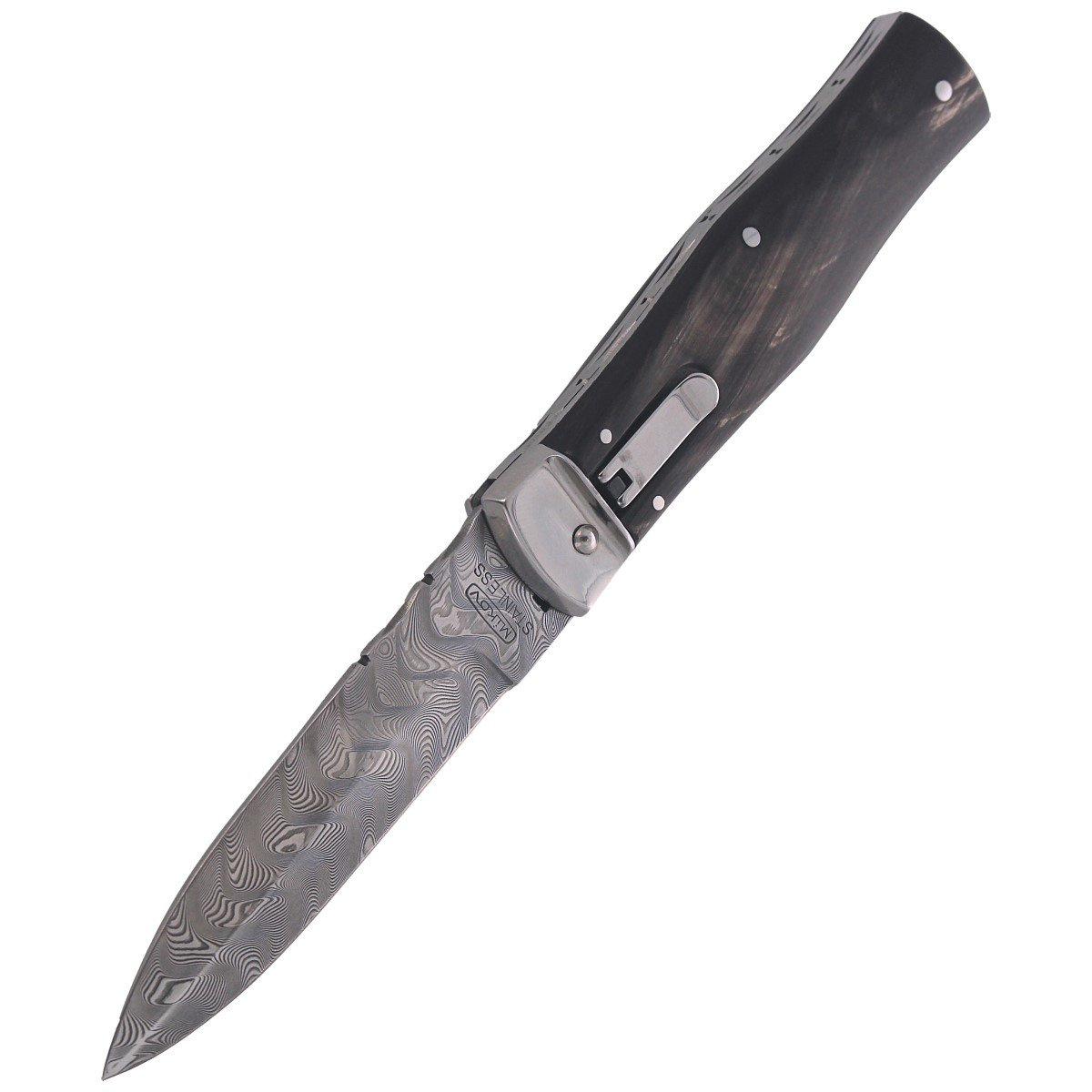 • Wildcat Damascus Buffalo Horn an artful version of the Mikov automatic knife with a damascus steel head. Solid construction, two strong opening springs, characteristic click when opening distinguish Predator from other spring-loaded knives. Leather case.