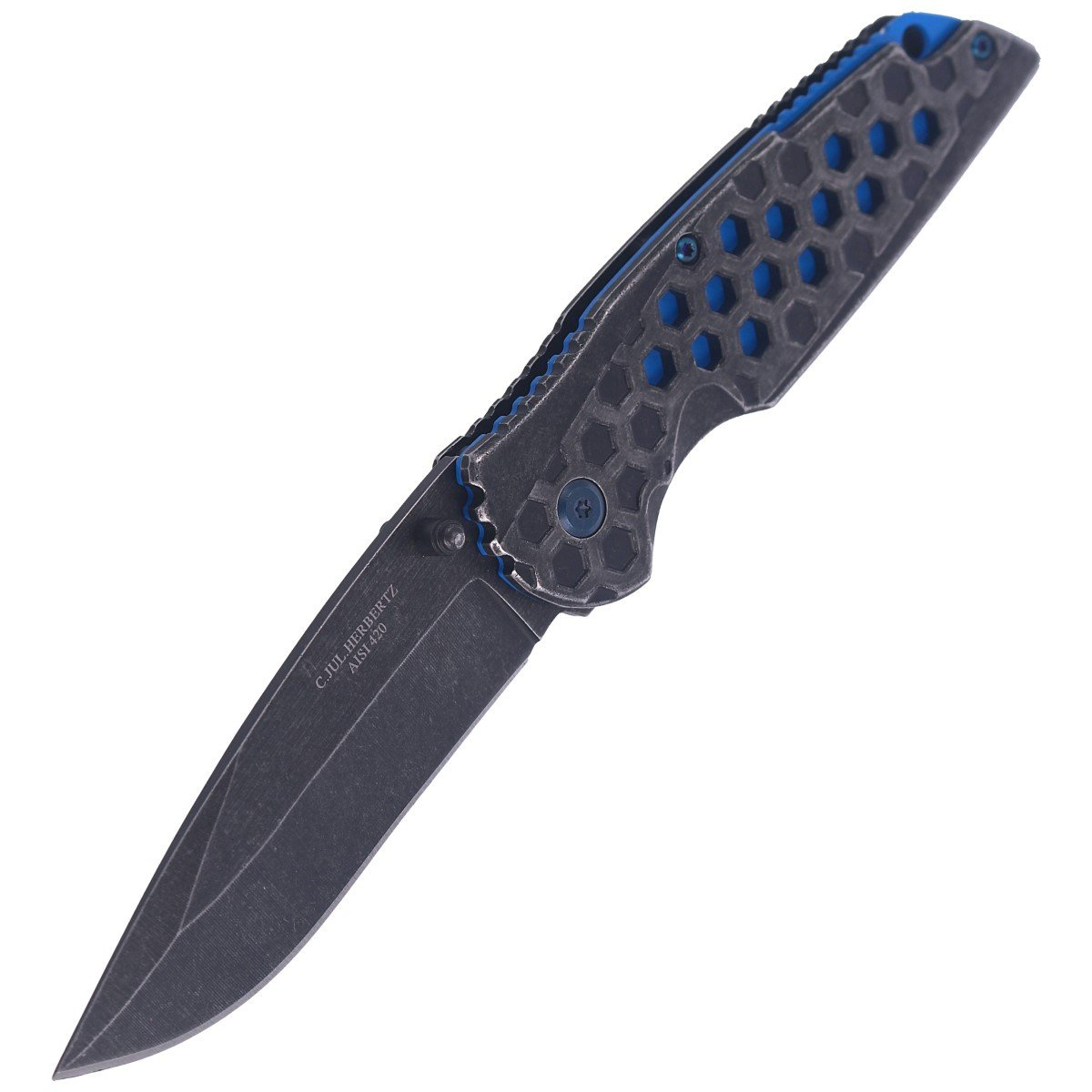 Handle - finished by stonewashed solid stainless steel covers stainless steel. Hexagonal cutouts in the facings create a color contrast allowing you to see the blue liner plates. Open design tzw. open-backed without the usual backspacer, fastened together with steel spacer sleeves for easy cleaning in the field. Spine Jimping notches on the back of the handle increase comfort and grip security. Metal clip (right-wing) allows the knife to be carried in the position tip-down (with the tip of the blade downward). Lanyard hole, elongated cable opening.