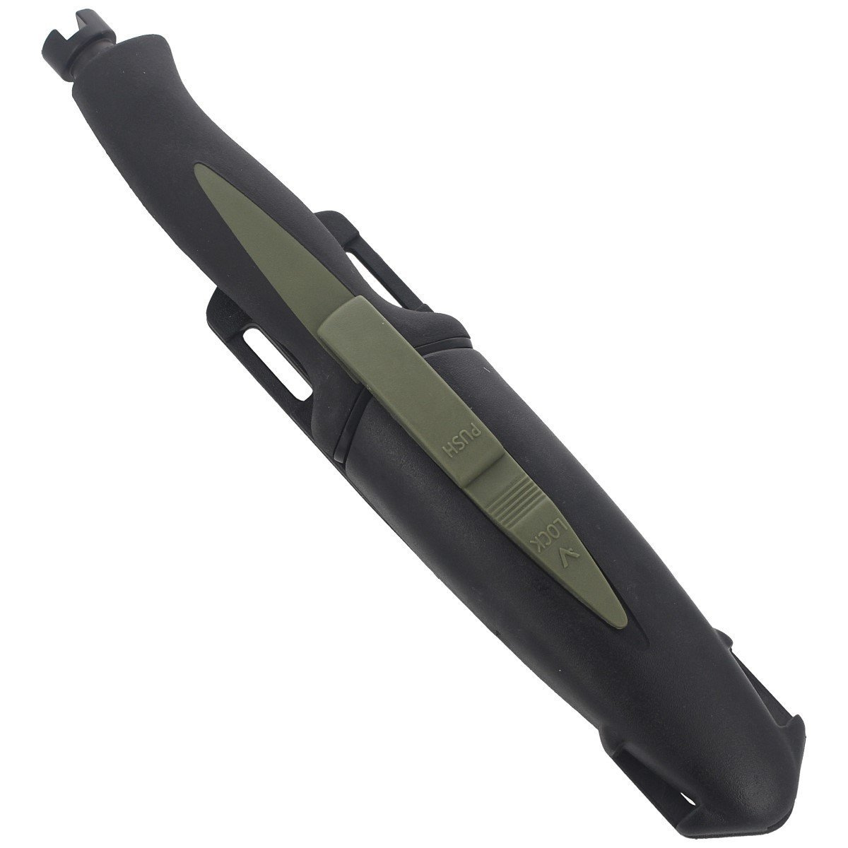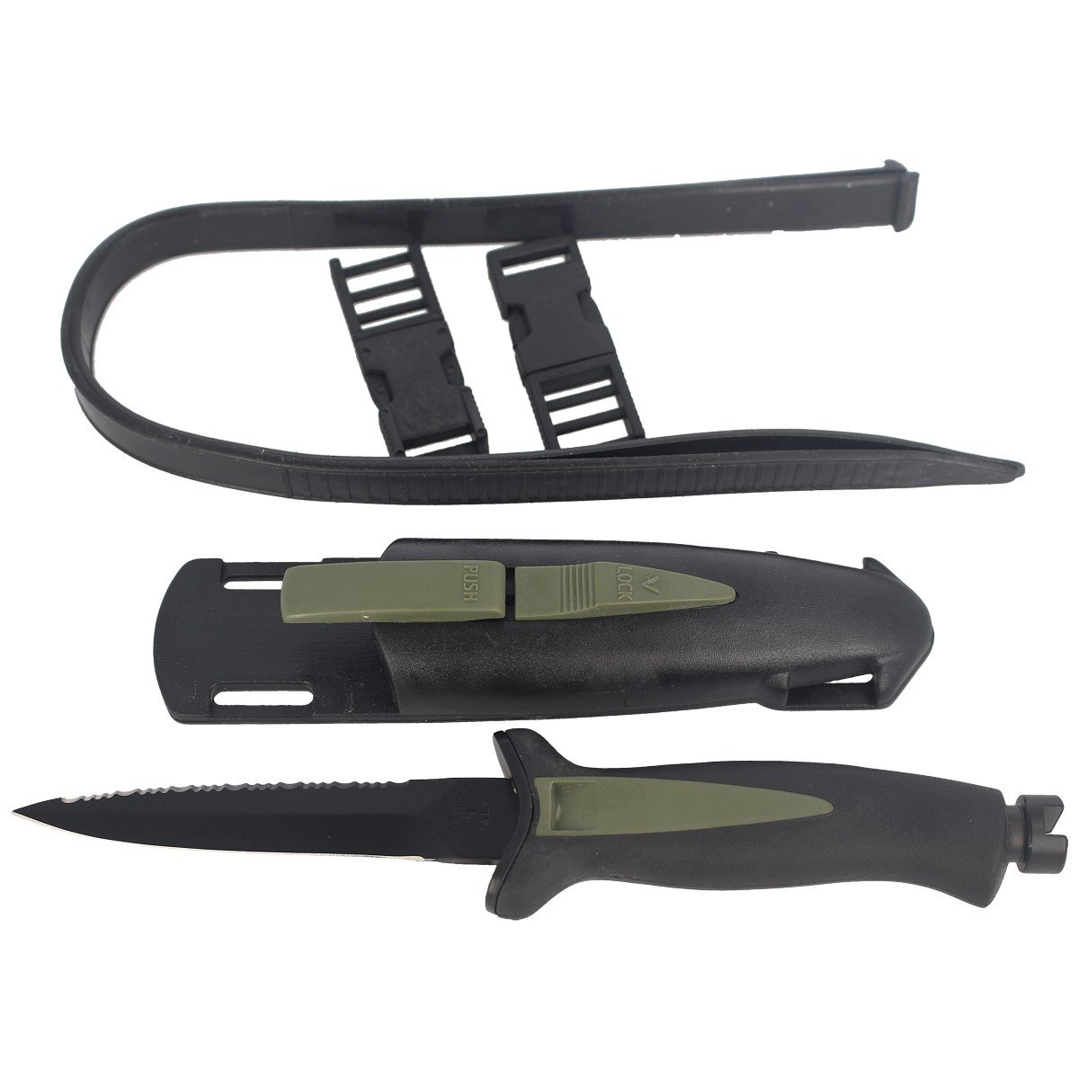 Sheath - made of ABS plastic with holes for drainage of water, moisture. The holster is equipped with a locking latch to prevent the knife from slipping out in water. The sheath comes with two rubber straps and 2 plastic buckles that allow you to attach the case to your arm, leg or to a vest.
