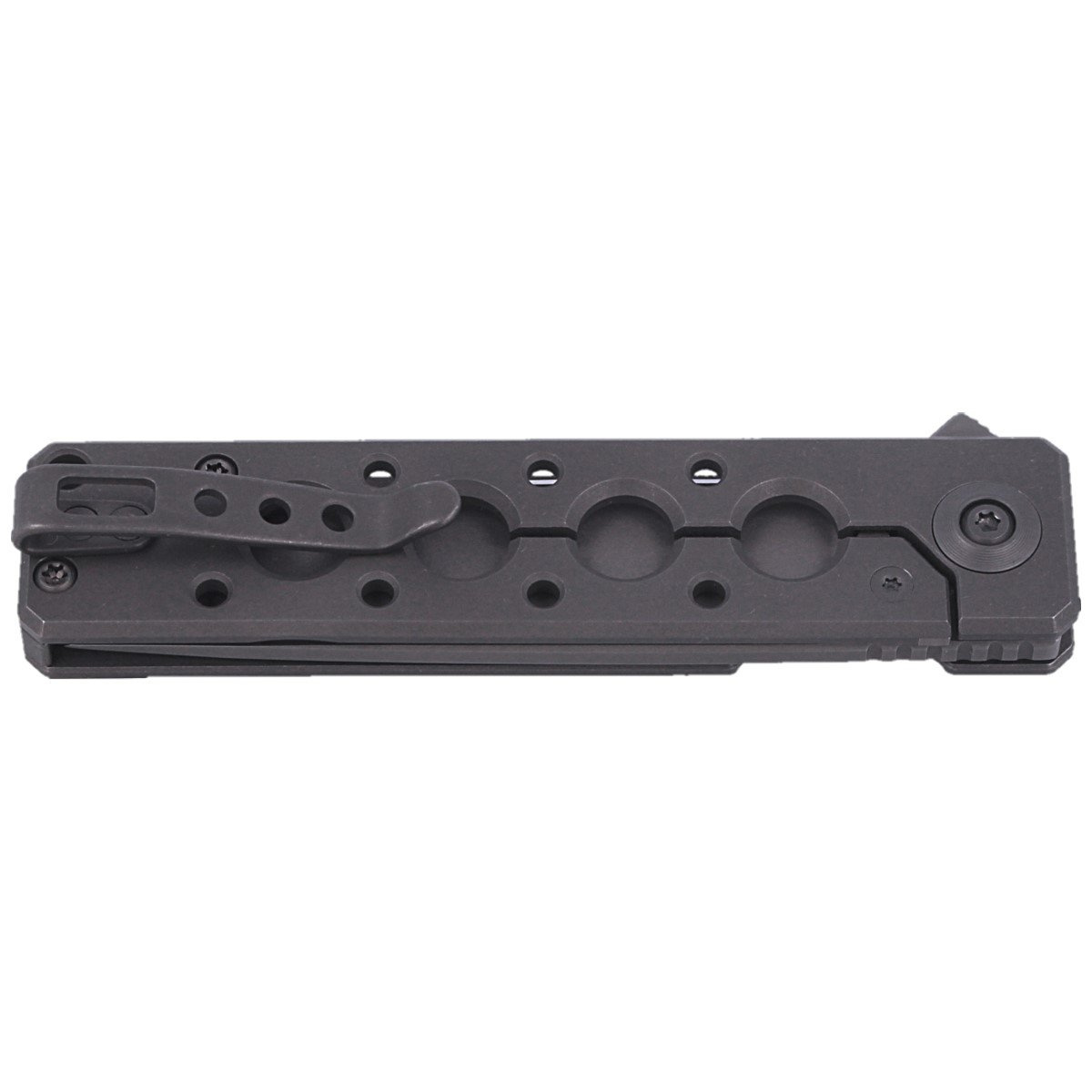 Handle - thick pieces of solid titanium in which several holes were made to reduce weight. For contrast, the holes were finished with satin finish. The facings have been screwed to the titanium backspacer. The simplicity and solidity of the design give assurance of many years of use. A deep-carry, single-position (right side) clip made of titanium allows the knife to be carried in tip-up position. Above the clip is a lanyard hole, which is a hole for threading a safety or decorative cord. As in other models, the pivot axis is decorated with a stylized logo of the manufacturer.
