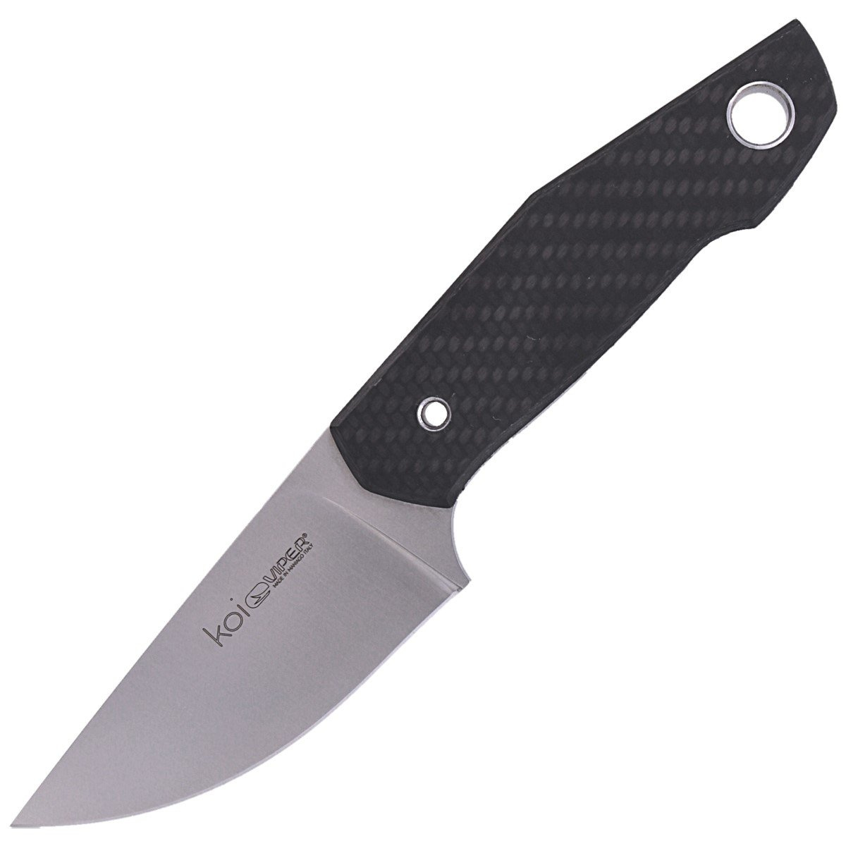 Koi Carbon Fiber, Satin N690 lightweight, compact fixed head knife, incredibly handy and easy to carry. Designed by renowned Danish knifemaker Jesper Voxnaes. It features a strong, short blade with a rounded cutting edge that is extremely versatile. Targeted at survival and trekking enthusiasts as well as professional users.