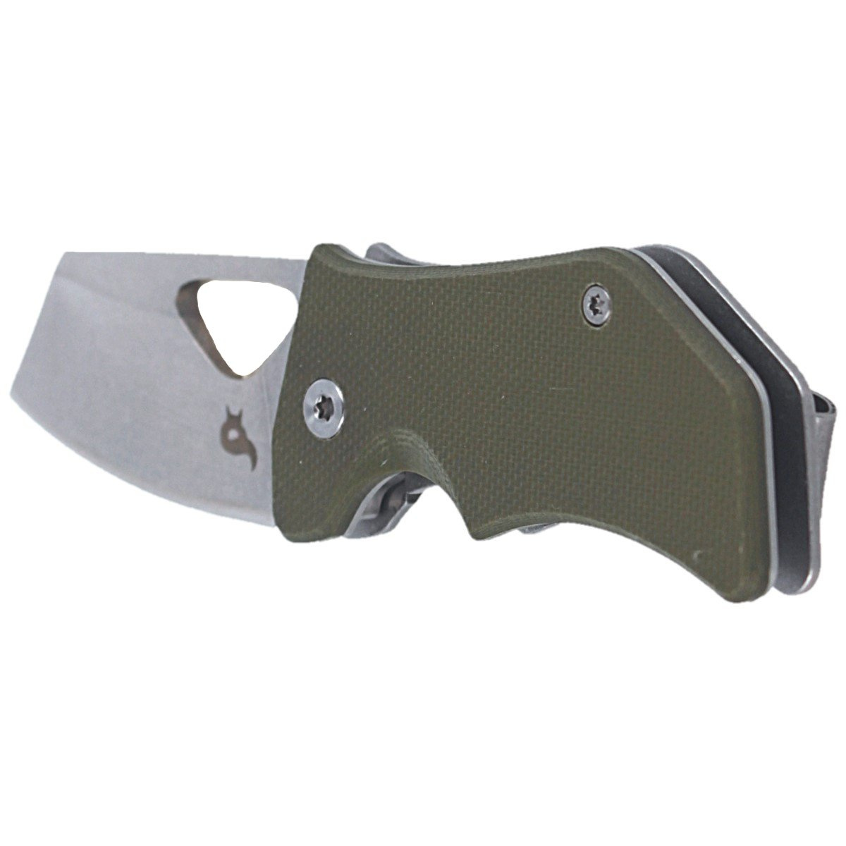 The handle is a green G10 screwed to the steel liner on one side and a thick piece of stainless steel on the other. The liners were screwed together using spacers to reduce weight and maintain the open design. The deep carry, single-position clip allows the knife to be carried in tip-up position.