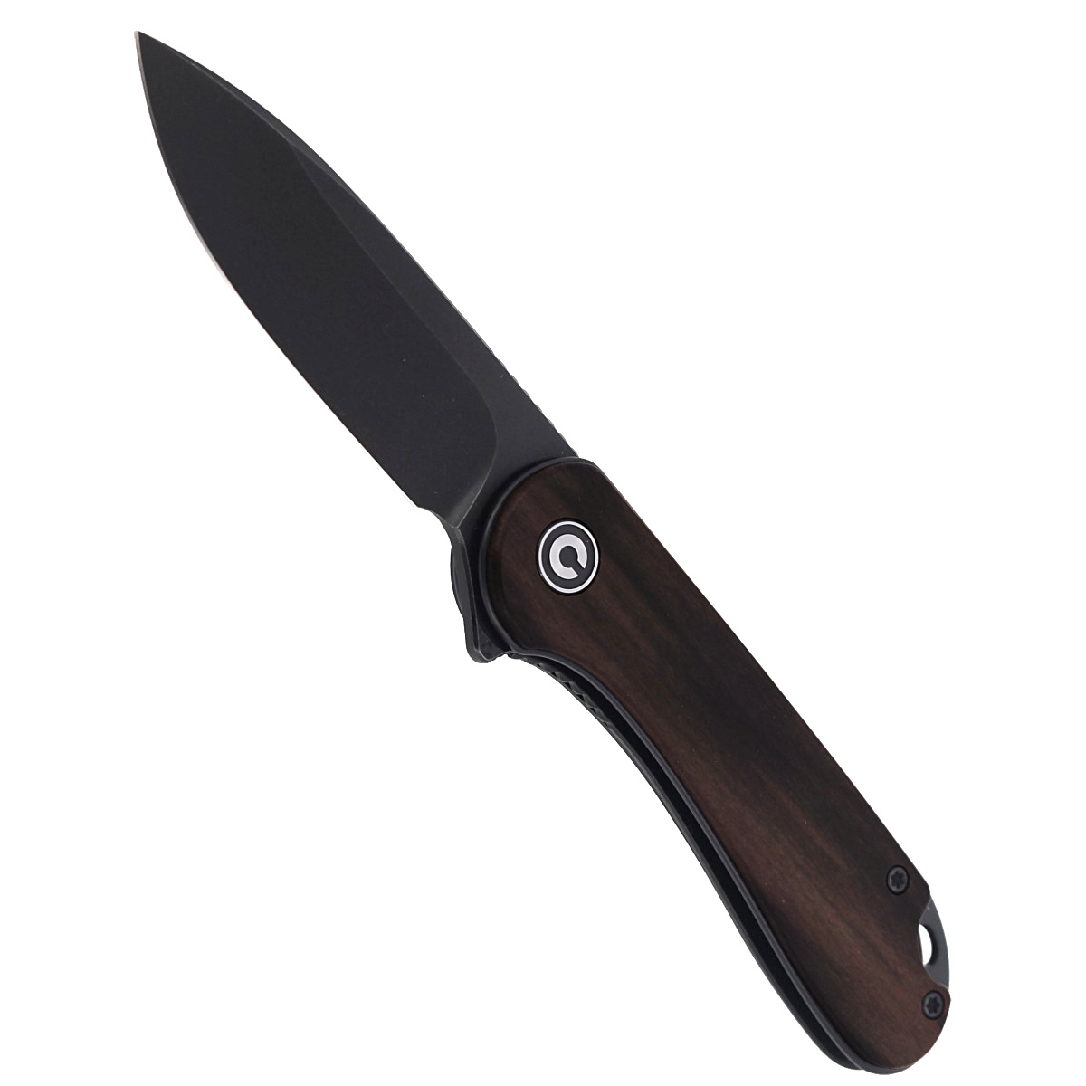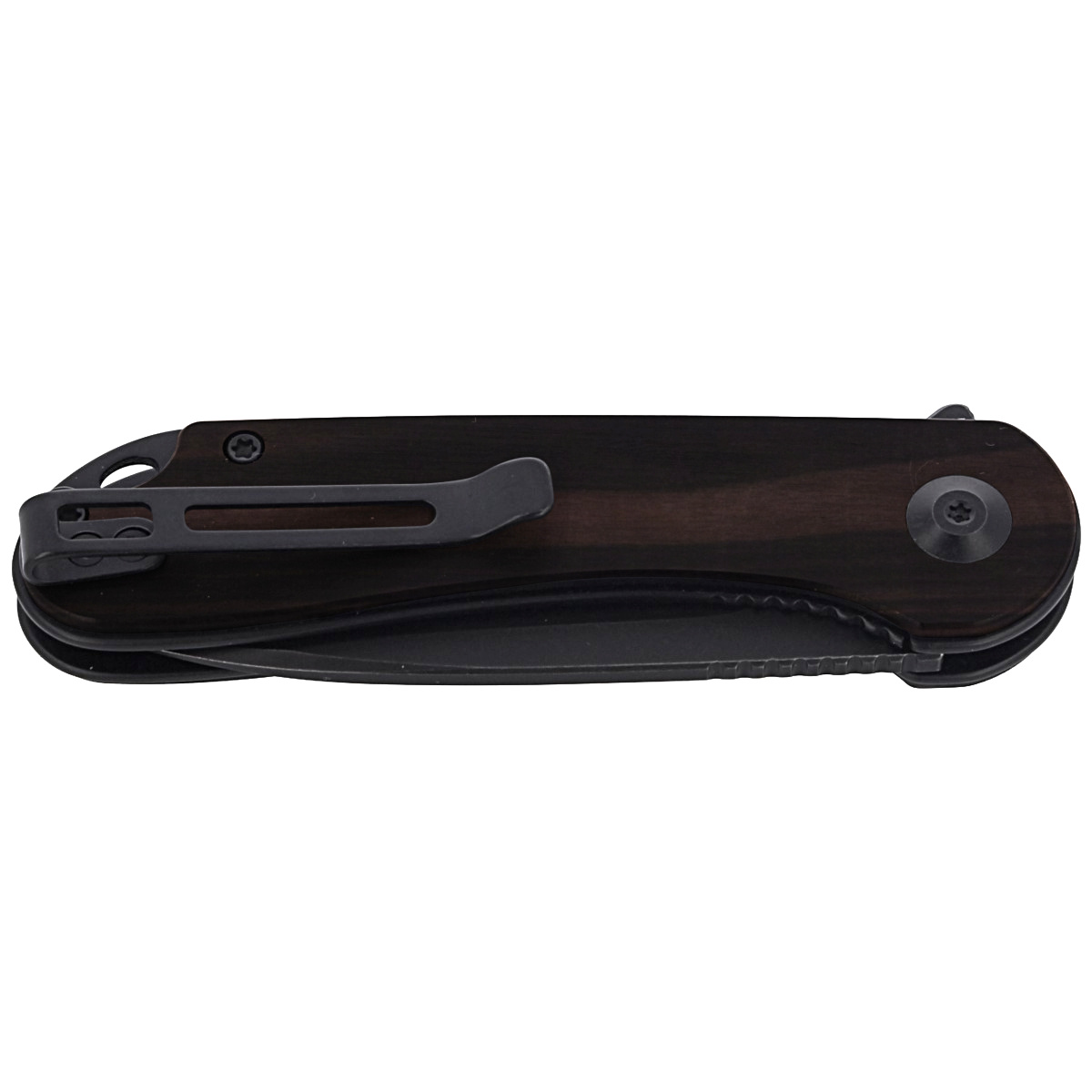 Handle - made of exotic Ebony wood in black color. Provides excellent grip and secure hold even with wet hands. The whole is mounted to stainless steel liners. In practice it means many years of work without weakening the construction. Open-backed construction without a typical backspacer, fixed to each other with steel spacers facilitates cleaning in the field. The pivot is decorated with a stylized Civivi brand logo. Right-side metal deep carry clip allows you to carry the knife discreetly in your pocket in tip-up (blade up) position. Lanyard hole, oval hole for cord.