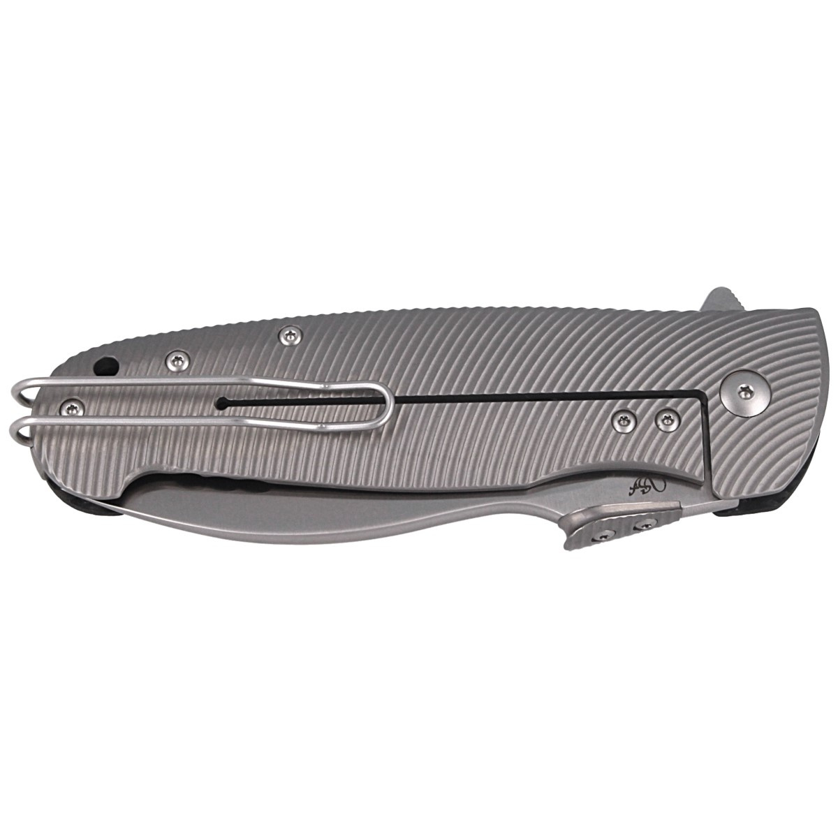 Drop Point type blade with well-marked belly emphasizes Satin finish. Slight thickness of the blade 4mm in conjunction with Full Flat Grind gives cutting properties on the level of a razor while maintaining above average durability. A ball bearing system assists in the smooth opening of the blade, which can be opened with a Thumb Plate on the back of the blade or with a flipper. The whole thing is locked with a proven and popular frame lock with a steel insert that protects against wiping the lock face.