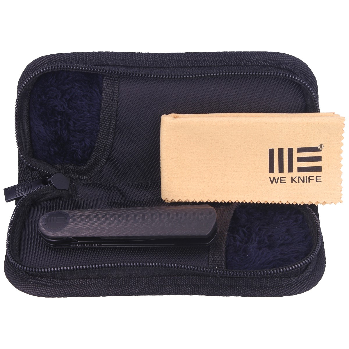 Handle - monolithic, made of a single piece of black Twill Carbon Fiber, milled with 3D CNC machine tools. This provides incredible strength, but requires the highest skill and precision in production. The pivot axis is adorned with a stylized WE brand logo. Right-side, one-position titanium deep carry clip allows you to carry the knife discreetly in your pocket in tip-up position.