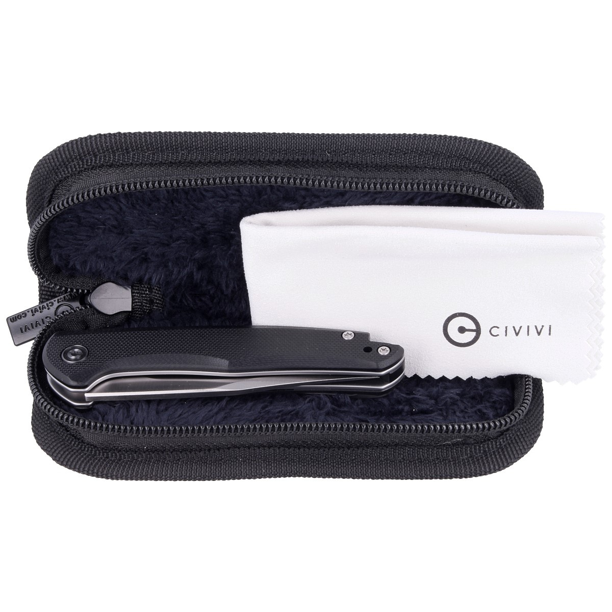 Chamfered G10 (glass fiber compressed with synthetic resin) in black color, attached to stainless steel liners. Surface of the liners with tactile texture for better grip. Simple, solid construction gives assurance of many years of use. Backspacer is made of the same material as the handle facings. The pivot is decorated with a stylized Civivi brand logo. Metal two-position deep left/right ascetic deep carry clip allows you to carry the knife discreetly in your pocket in tip-up position. Backspacer recess, lanyard hole, cord hole.