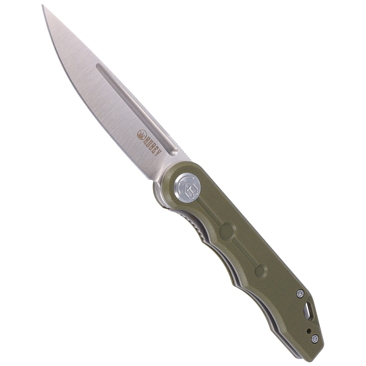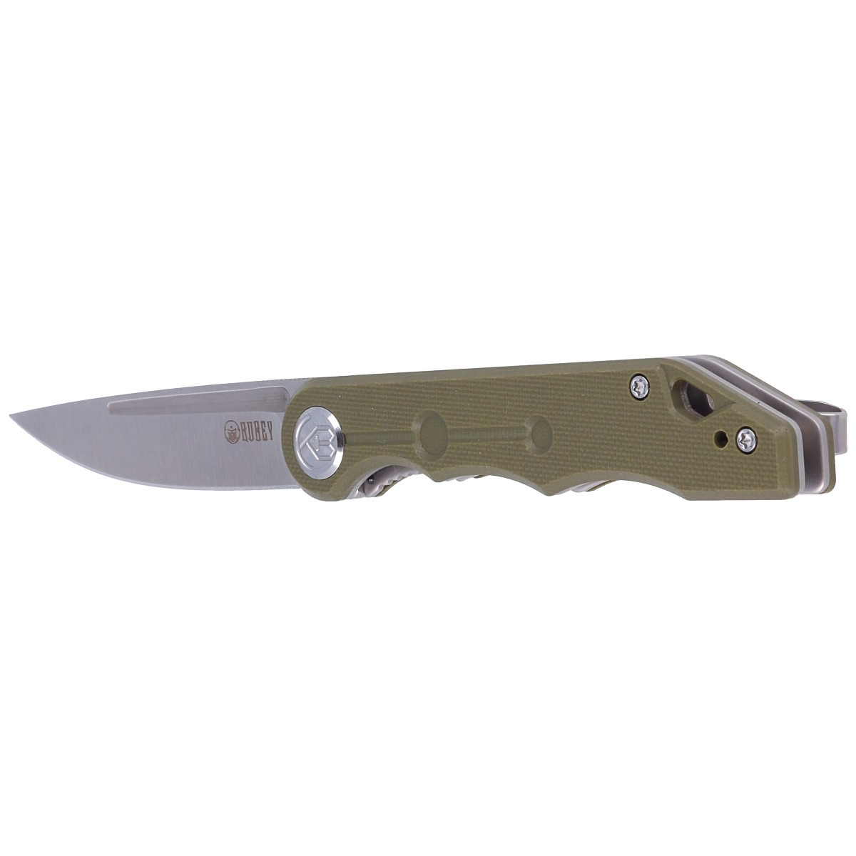 Handle - green G10 (pressure-pressed fiberglass with synthetic resin) facings,textured for improved grip security, bolted to the knife's steel frame. The so-called open-backed design without the typical backspacer, fastened together with steel spacers for easy cleaning. The simple, solid construction gives you the assurance of many years of use. Fore finger groove improves grip security. The pivot axis is decorated with a stylized manufacturer's logo. A two-position (right and left) metal deep carry clip allows you to carry the knife discreetly in your pocket in tip-up position (blade tip up). Above the clip a lanyard hole, a hole for threading a safety or decorative cord.