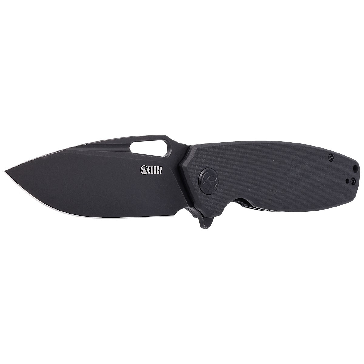 Handle - black G10 (pressure-pressed fiberglass with synthetic resin) facings, textured to improve grip security, bolted to the knife's steel frame. The open-backed design, so called, fastened together with steel spacer sleeves, reduces weight and makes cleaning easier. The simple, sturdy design gives assurance of many years of use. A deep finger undercut (fore finger groove) improves grip confidence. The pivot axis is decorated with a stylized Kubey Knife brand logo. A two-position (right/left) metal deep-carry clip allows you to carry the knife discreetly in your pocket in tip-up (blade tip up) position. Above the clip a lanyard hole, a hole for threading a safety or decorative cord.