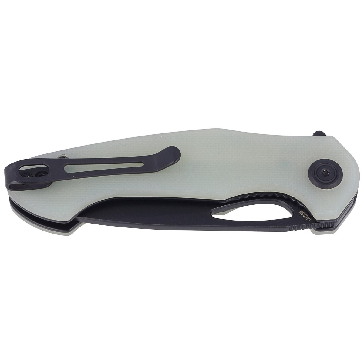 The handle - facings made of jade G10 (fiberglass compressed under pressure with synthetic resin),textured to improve grip security, is screwed to the steel frame of the knife. The whole screwed together with spacer sleeves. Simple, solid construction gives you the assurance of many years of use. A deep finger undercut (fore finger groove) improves grip security. The pivot axis is decorated with a screw with a stylized manufacturer's logo. A two-position (right and left) metal deep-carry clip allows you to carry the knife discreetly in your pocket in tip-up position (blade tip up). Hidden in the back of the handle is a place to thread a safety or decorative cord.
