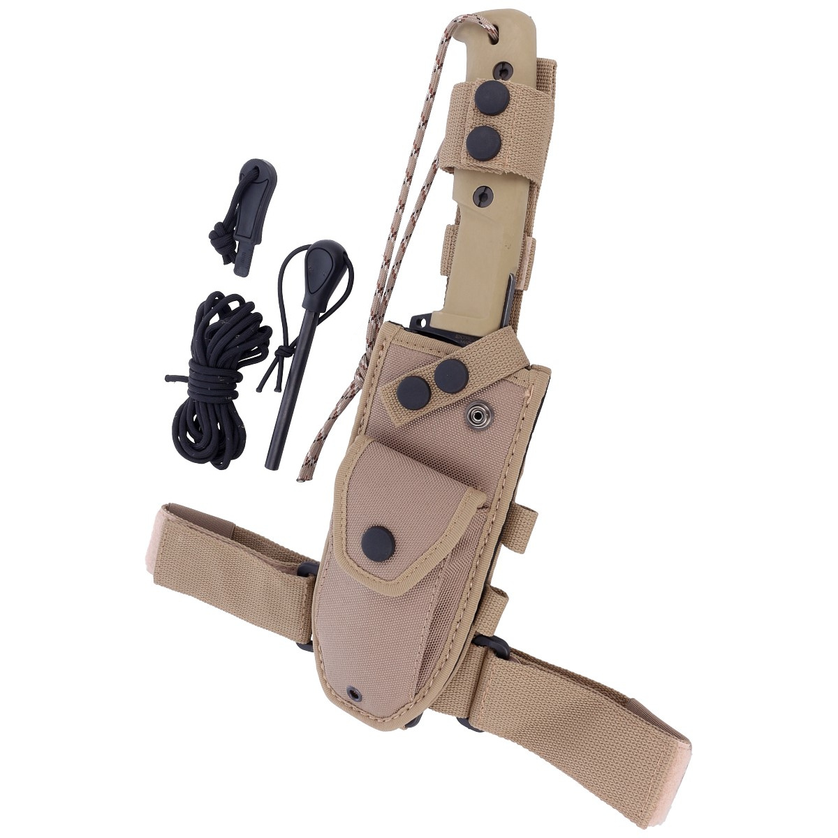 Sheath - thigh sheath made of abrasion-resistant, waterproof cordura in sand color with the possibility of attachment under the straps of the M.O.L.L.E. (Modular Lightweight Load-carrying Equipment) system. The holster allows the knife to be carried on a belt or on a vest compatible with the MOLLE system. The lower part of the sheath with Velcro fastening, allowing attachment to the thigh. On the side of the sheath a flint attachment (included), in the pouch paracord and flammable material for lighting a fire with a flint.