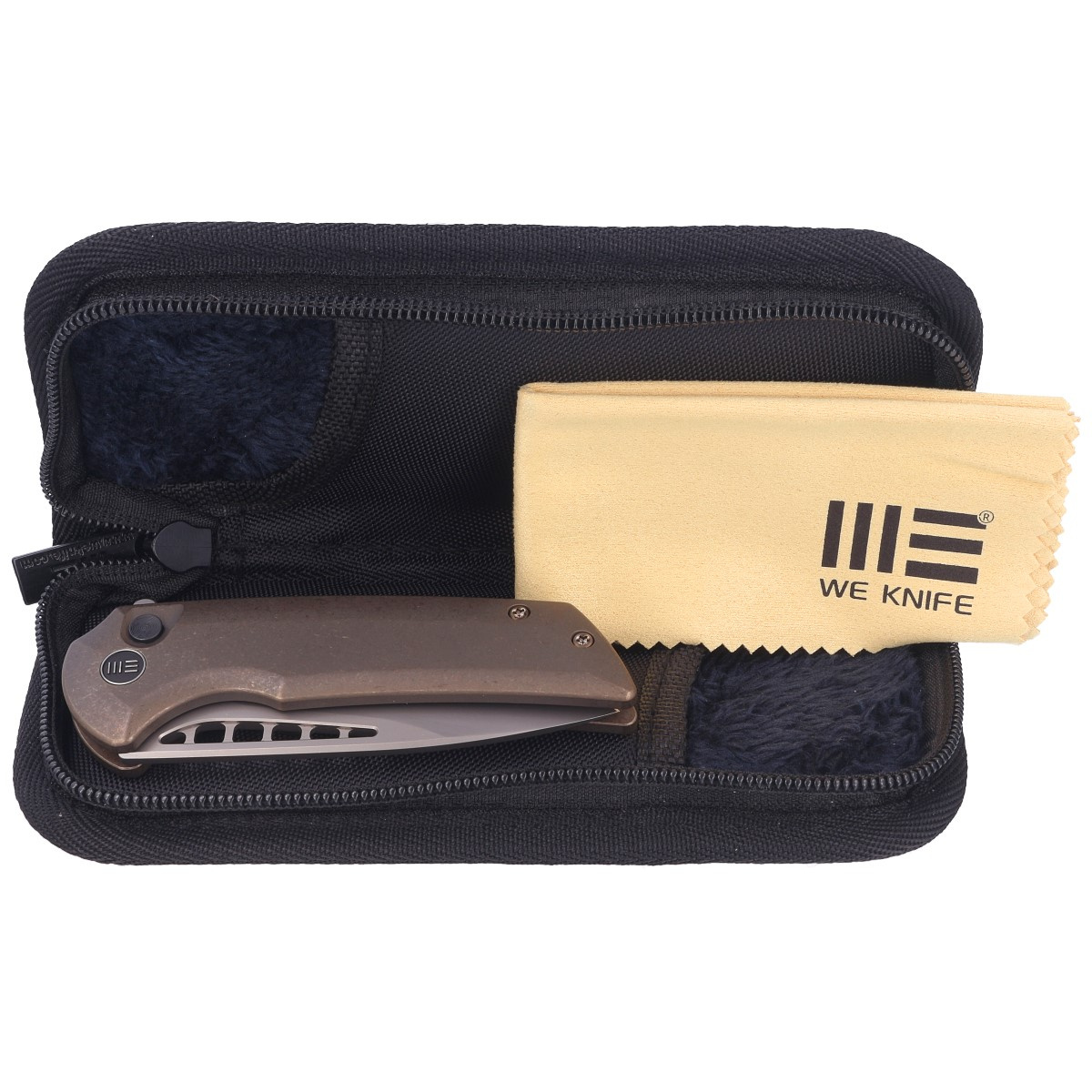 Handle - made of titanium 6AL4V, beveled edges of the covers eliminate sharp edges. Open-backed design - fixed with titanium spacer sleeves - reduces weight and facilitates cleaning. The pivot axis is decorated with a stylized WE Knife brand logo. A single-position (right) titanium deep-carry clip allows you to carry the knife discreetly in your pocket in tip-up position (blade tip up).
