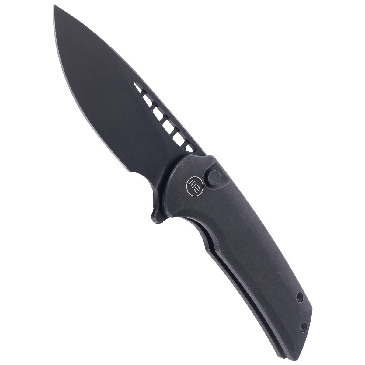 Handle - made of titanium 6AL4V, beveled edges of the covers eliminate sharp edges. Open-backed design - fixed with titanium spacer sleeves - reduces weight and facilitates cleaning. The pivot axis is decorated with a stylized WE Knife brand logo. A single-position (right) titanium deep-carry clip allows you to carry the knife discreetly in your pocket in tip-up position (blade tip up).