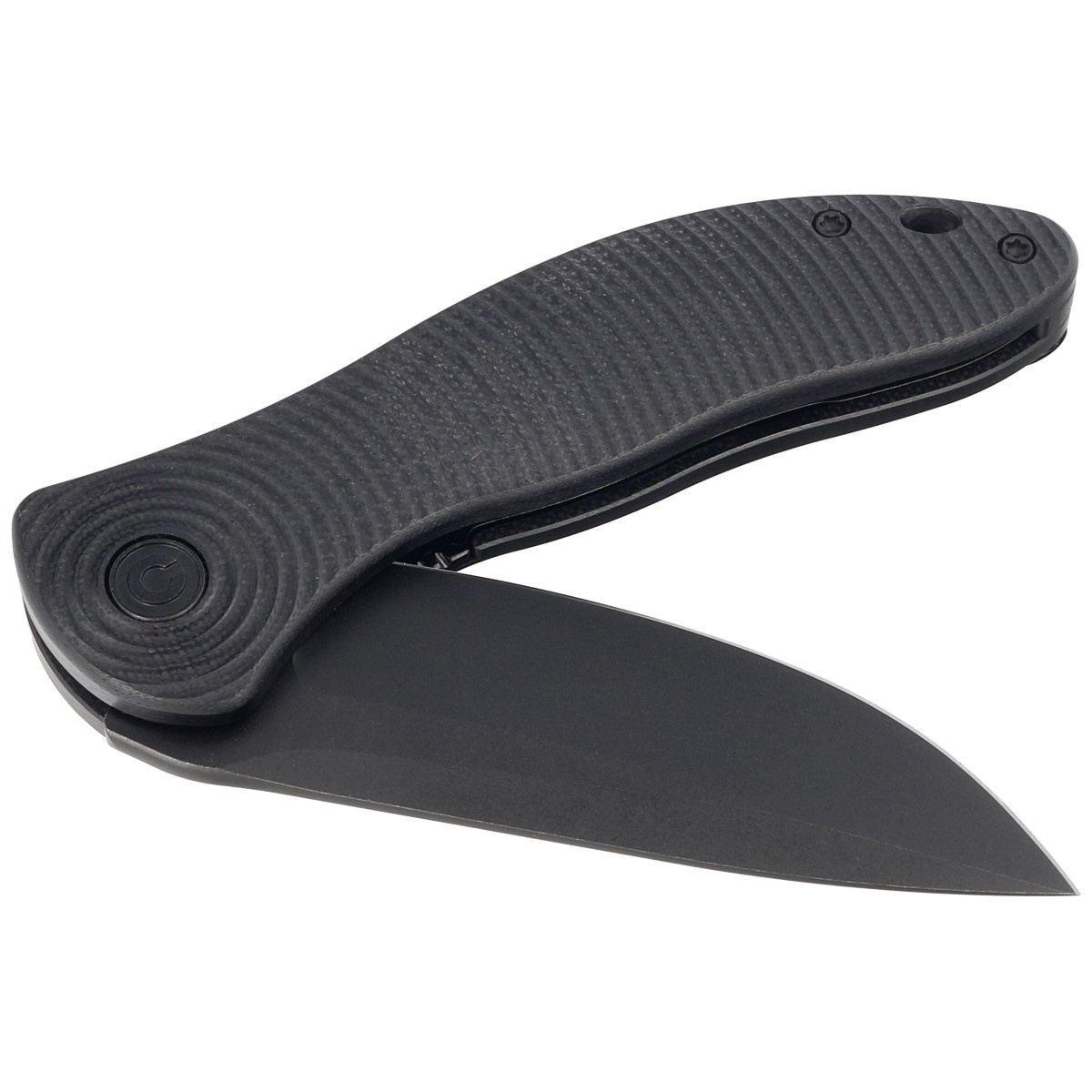 Handle - black G10, fiberglass facings pressed with resin, with a beautiful pattern of concentrically spreading circles. Chamfered edges of the covers eliminate sharp edges for comfort and improve grip confidence. The backspacer is made of the same material as the handle grips. The pivot is decorated with a stylized Civivi brand logo. A single-position, right-side deep carry clip allows you to carry the knife discreetly in your pocket in tip-up position (blade tip up).