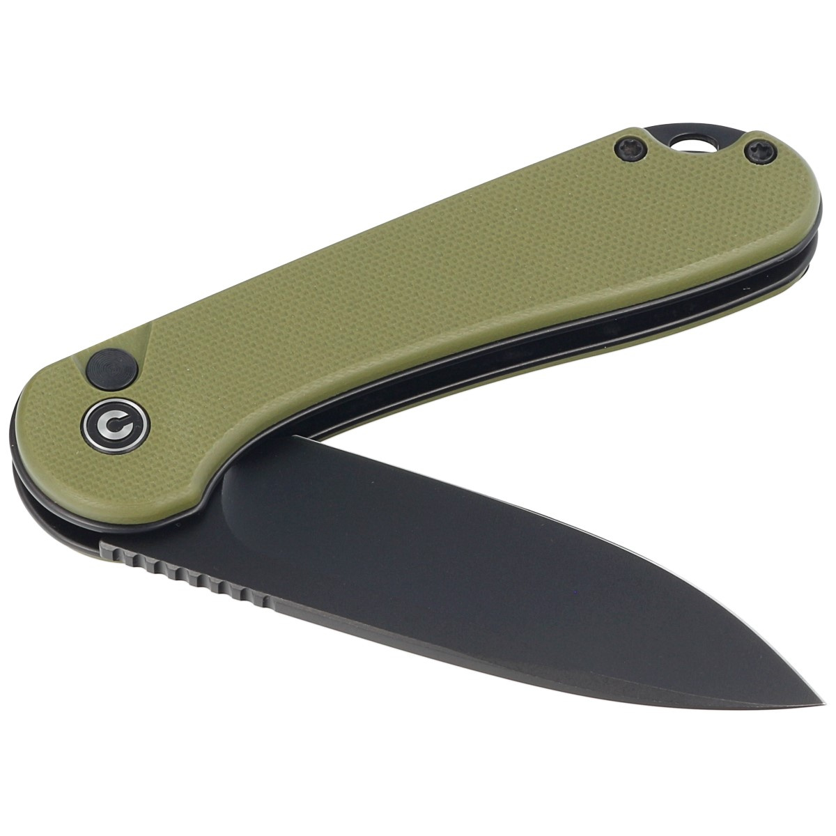 Handle - textured covers in OD Green color made of G10, a composite material of fiberglass and synthetic resin. All attached to stainless steel liners. Simple, solid construction gives you the assurance of many years of use. Open-backed design fixed with steel spacer sleeves reduces weight and makes cleaning easier. The pivot axis is decorated with a stylized Civivi brand logo. Metal one-sided (right) deep-carry clip allows you to carry the knife discreetly in your pocket in tip-up position (blade tip up).