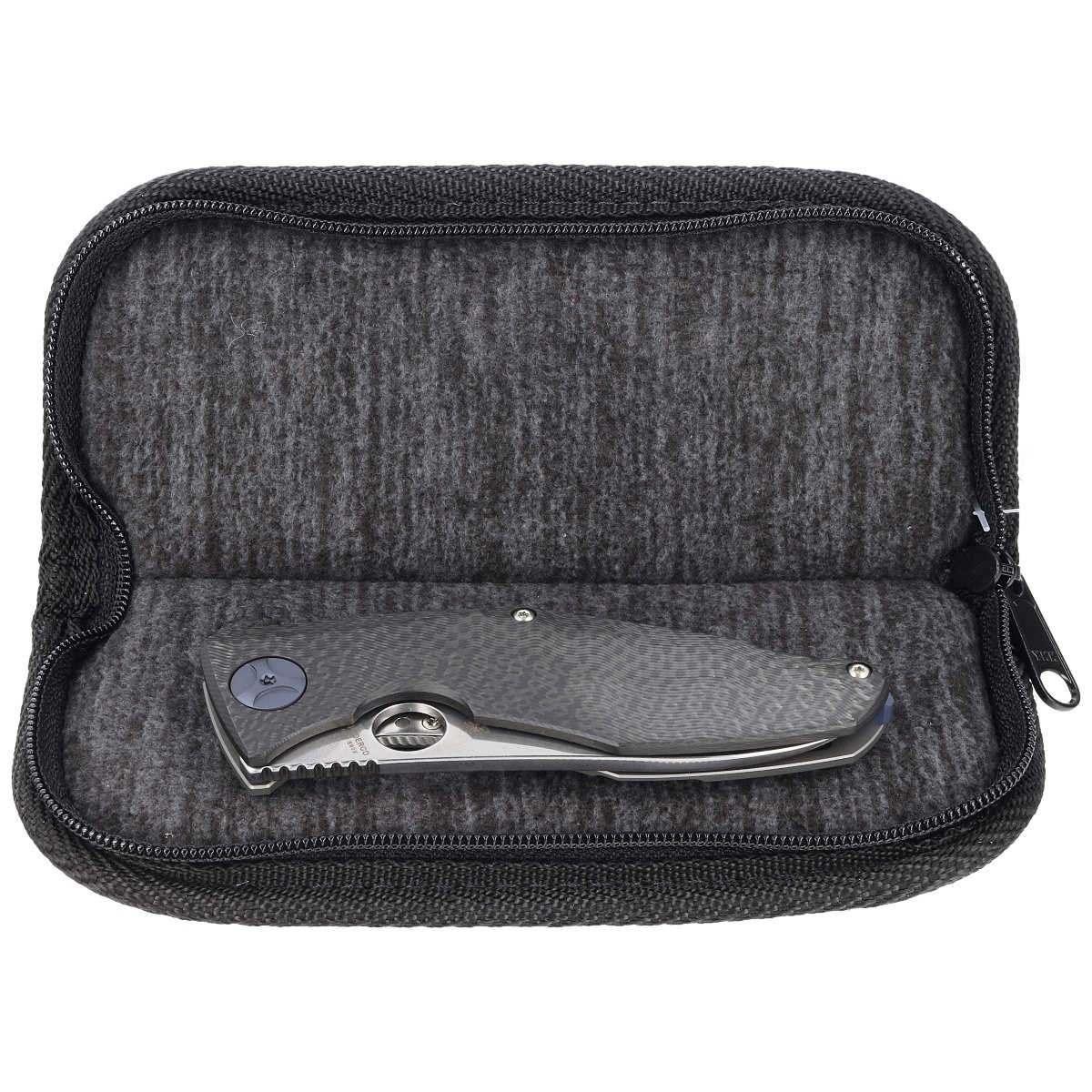 Handle - on the presentation side Carbon Fiber with a chaotic, "drunk" (Drunken) pattern. On the lock side, a solid piece of titanium covered with a delicate spider thread pattern. The facings are connected to each other by a backspacer, anodized in blue. The pivot screw and clip were anodized with the same color. A sturdy, single-sided (right) titanium clip allows the knife to be carried in tip-up position (with the tip of the blade up). The top of the backspacer features a lanyard hole, a hole for a lanyard or cord.