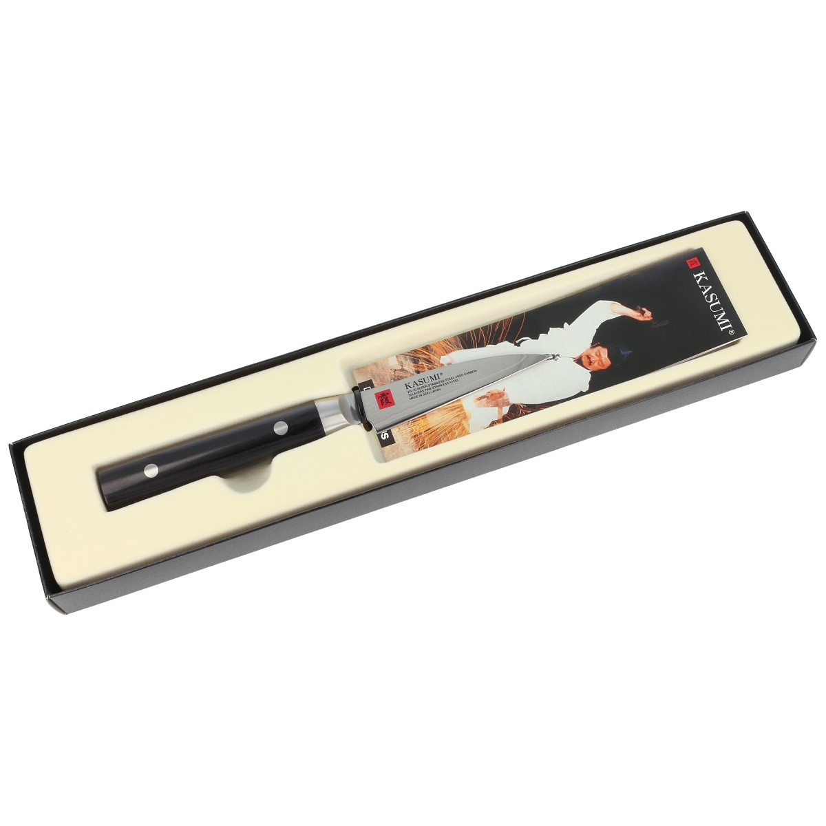 Kasumi Damascus Paring with VG-10 stainless steel core finished with 32 ply damascus. Made using the same methods as samurai swords, with a comfortable European pakka wood handle. Note!!! Very sharp!!! In 2002, "KASUMI" knives won the Design Plus Award at Ambiente Messe in Germany.