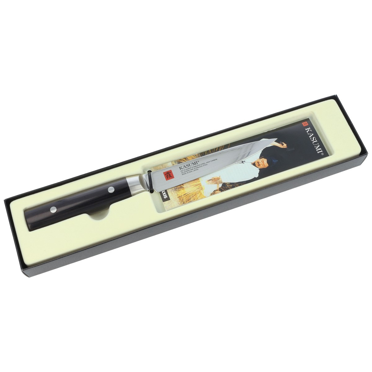 Kasumi Damascus Utility with VG-10 stainless steel core finished with 32 ply damascus. Made using the same methods as samurai swords, with a comfortable European pakka wood handle. Note!!! Very sharp!!! In 2002, "KASUMI" knives won the Design Plus Award at Ambiente Messe in Germany.