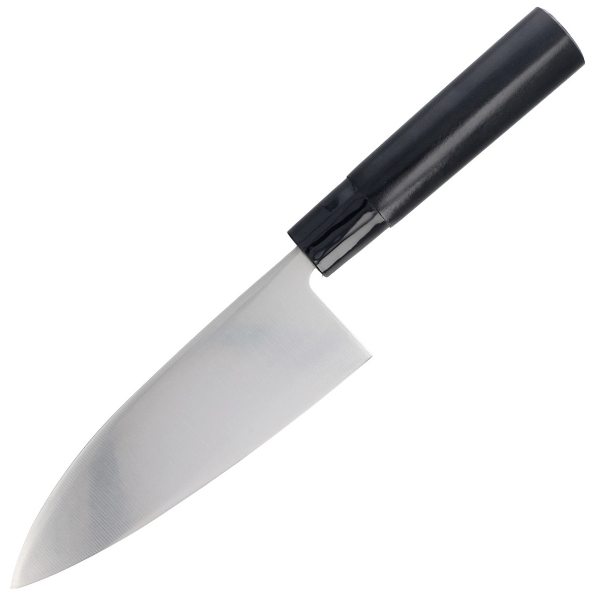 Kasumi Tora Deba in Molybdenum Vanadium Stainless Steel. Made using the same methods as samurai swords, with a comfortable round handle made of magnolia wood laminated with black epoxy. Note!!! Very sharp!!! In 2002, "KASUMI" knives won the Design Plus Award at Ambiente Messe in Germany.