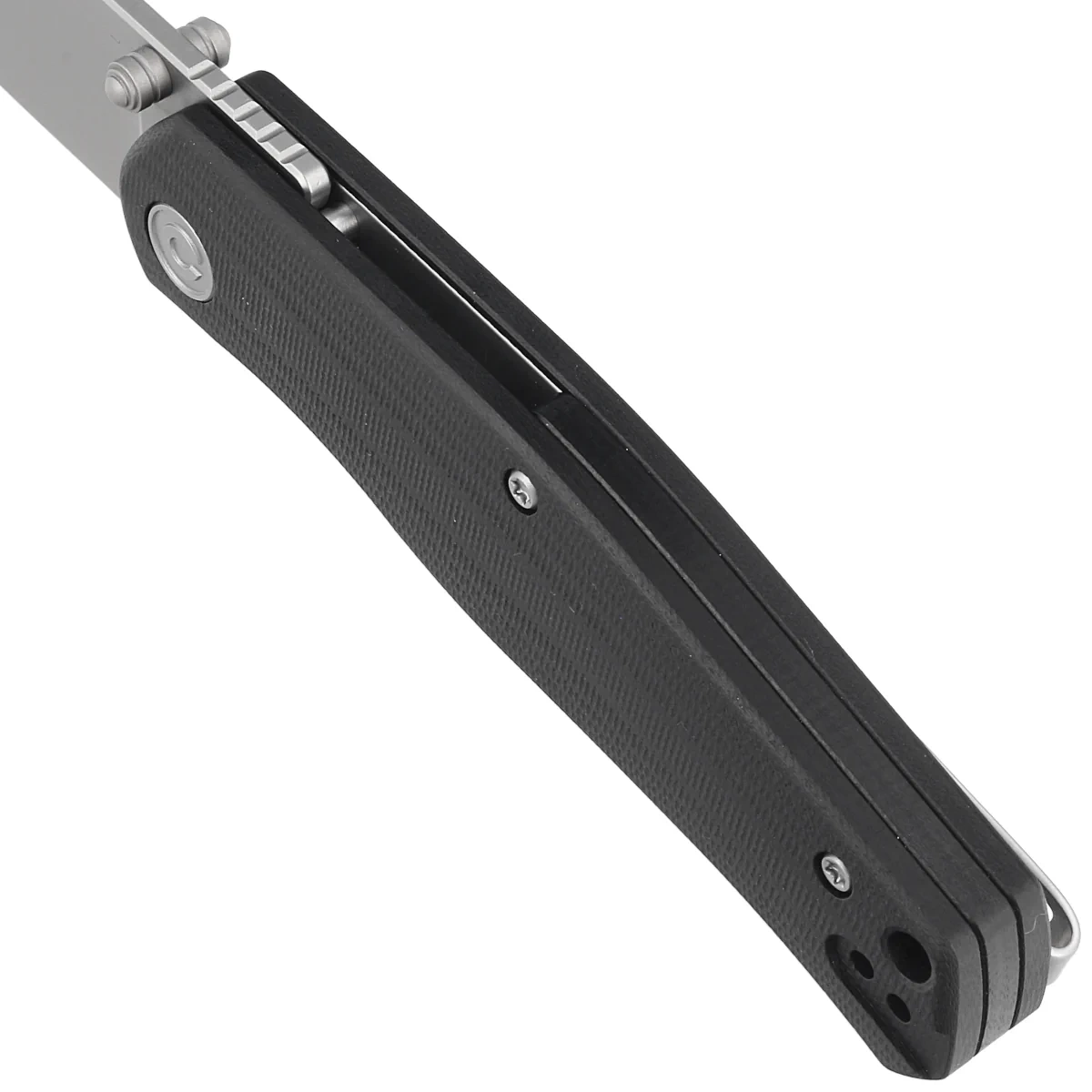 Handle - made of G10 composite (fiberglass compressed under pressure with synthetic resin), beveled edges of the cover eliminates sharp edges. The whole screwed to a solid backspacer, also made of G10. Above the clip a hole for threading a belaying or decorative cord. The pivot is decorated with a stylized Civivi brand logo. A two-position (right/left) steel deep carry clip allows you to carry the knife discreetly in your pocket in tip-up position (blade tip up).