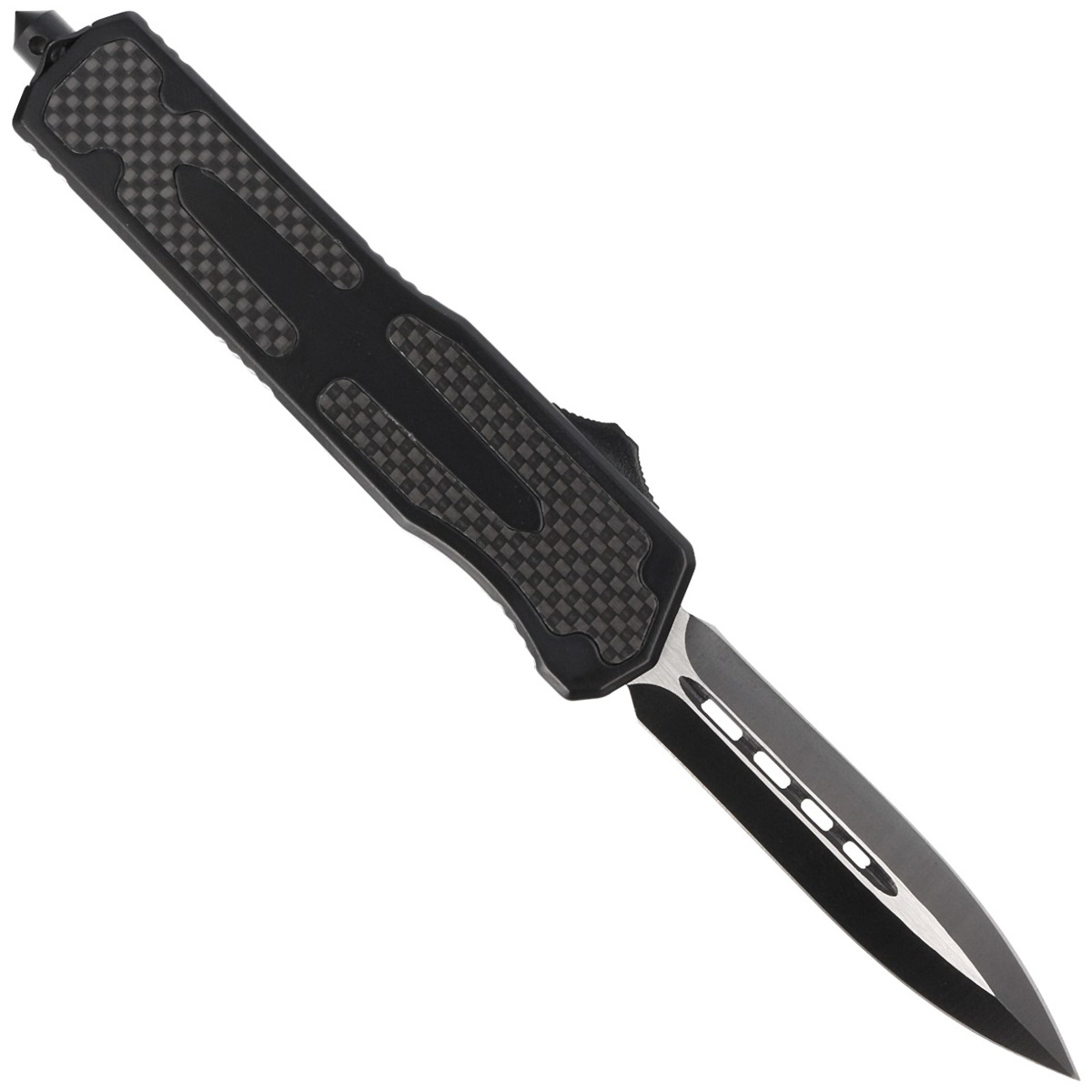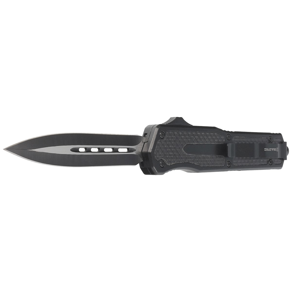 • Dulotec OTF Dagger Aluminum / Carbon Fiber, Two-Tone automatic OTF (Out The Front) knife operating in D/A (Double Action) mode, i.e. with a slider you extend and retract the blade. Strong construction, reliable operation and reasonable price. Bestseller!