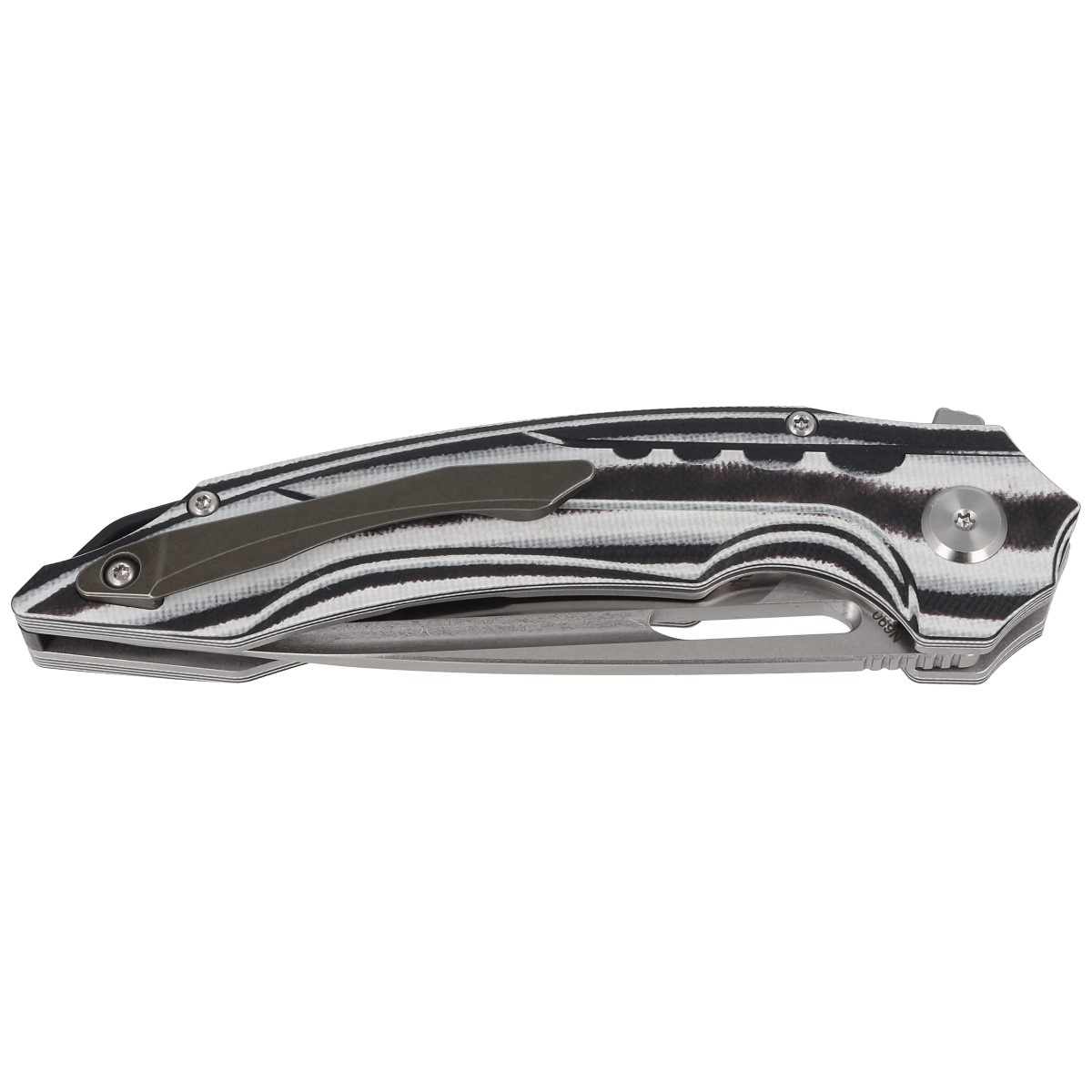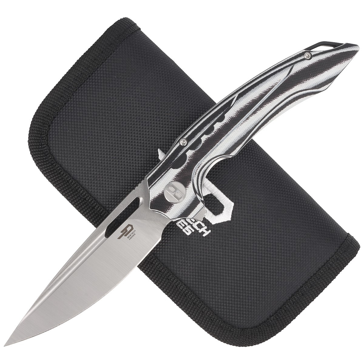 Handle - a heavily curved, two-tone handle made of G10 composite (pressure-pressed fiberglass with synthetic resin) and carbon fiber provides an excellent grip in many positions. Chamfered cover edges eliminate sharp edges. Bolted to a solid steel backspacer, with a hole at the top for a safety or decorative cord. The pivot is decorated with a stylized letter "B". A titanium, single-position, right-handed deep-carry clip allows you to carry the knife discreetly in your pocket in the tip-up (blade tip up) position. A fore finger groove improves grip security.