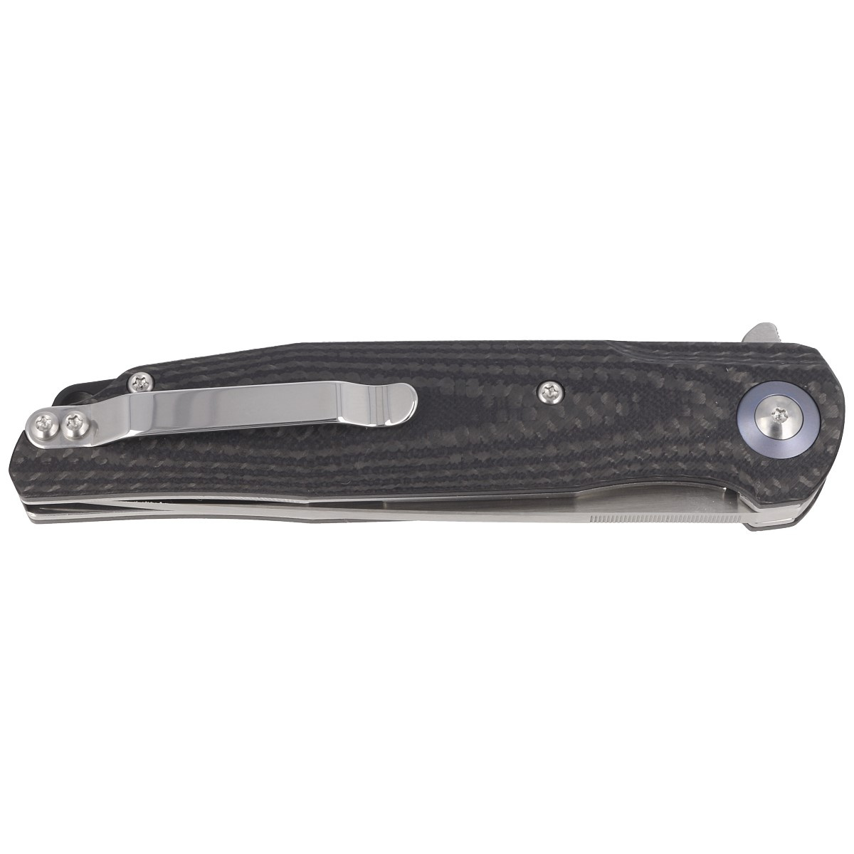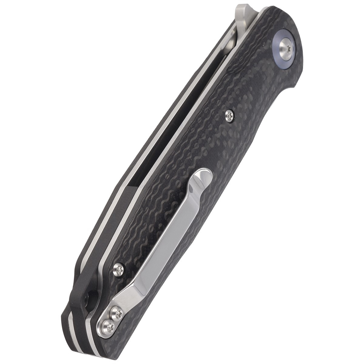 Handle - the grips are made of Carbon Fiber-coated G10, a virtually indestructible plastic that is insensitive to weather conditions, resistant to chemicals and mechanical damage Chamfered edges of the covers eliminate sharp edges and characteristic texturing of the surface improves grip security. The massive backspacer to which the grips are attached guarantees the rigidity and strength of the entire structure. The simple, solid construction gives the assurance of many years of use. Around the pivot a decorative, blue-tinted ring. A single-position, right-handed clip allows the knife to be carried in tip-up position, with the tip of the blade upward. Above the clip a hole for threading a safety or decorative cord.