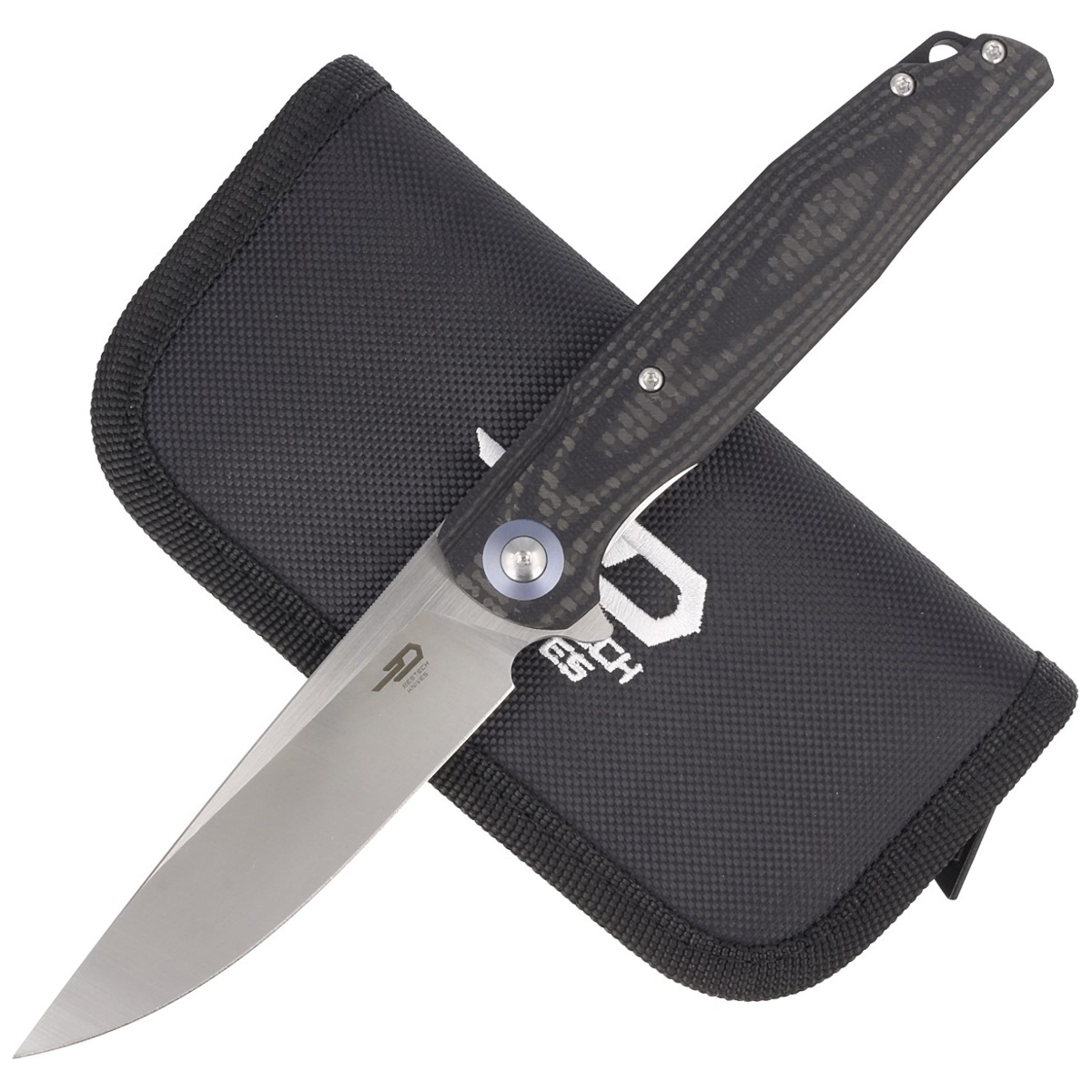 Ascot Carbon Fiber / Black G10, Satin an elegant EDC folder with versatile use. Featuring G10 and Carbon facings on the Handle grips, a long Blade made of proven D2 tool steel, all at an excellent price and quality from Bestech! Bestech!