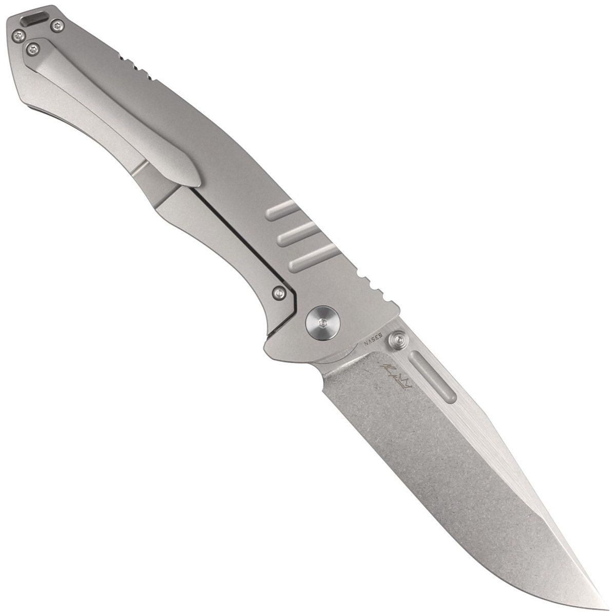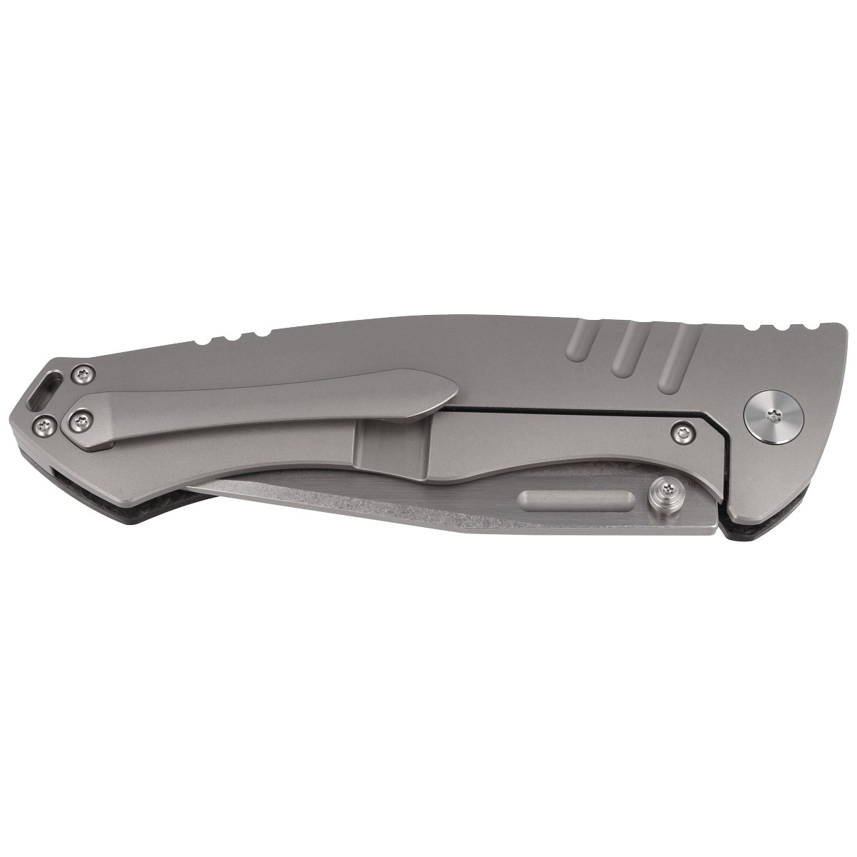 Handle - representative side made of Marble Carbon Fiber, lock side made of solid titanium 6AL4V. Chamfered cover edges eliminate sharp edges for comfort and improve grip security. The solid titanium backspacer to which the facings are attached guarantees the rigidity and strength of the entire structure. A section of the back of the handle is covered with an upper jimping, notched thumb rest for easy control of the knife. A single-position, right-handed titanium clip allows the knife to be carried in the tip-up position, with the tip of the blade upward.