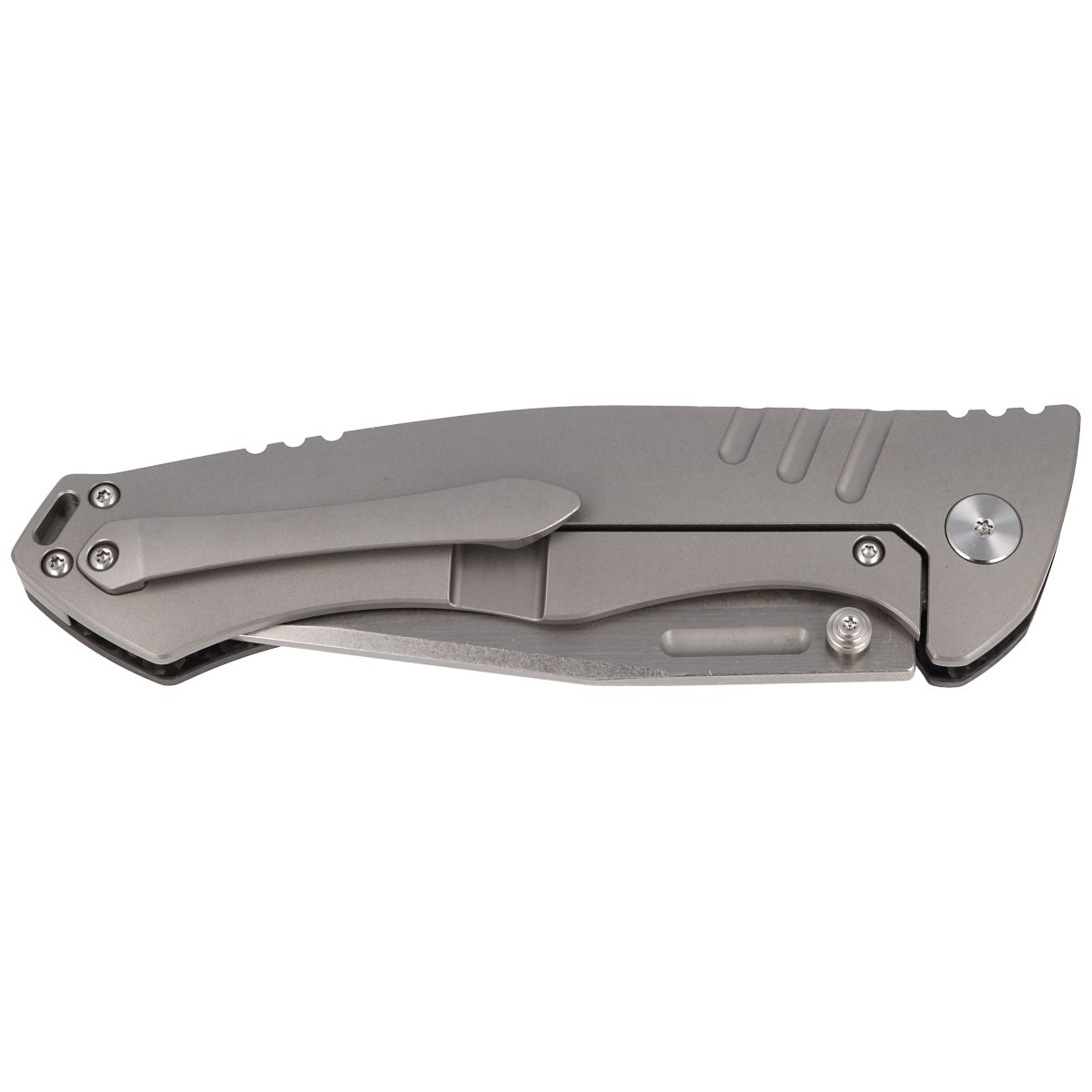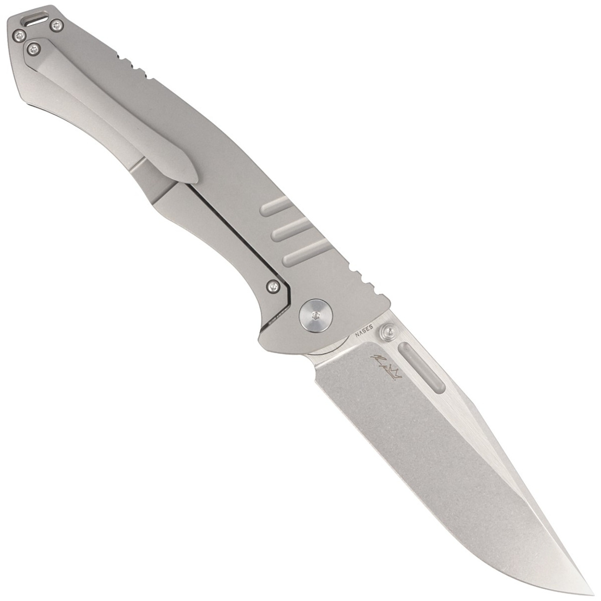 Handle - representative side made of Carbon Fiber, lock side made of solid 6AL4V titanium. Chamfered cover edges eliminate sharp edges for comfort and improve grip security. The solid titanium backspacer to which the facings are attached guarantees the rigidity and strength of the entire structure. A section of the back of the handle is covered with an upper jimping, notched thumb rest for easy control of the knife. A single-position, right-handed titanium clip allows the knife to be carried in the tip-up position, with the tip of the blade upward.
